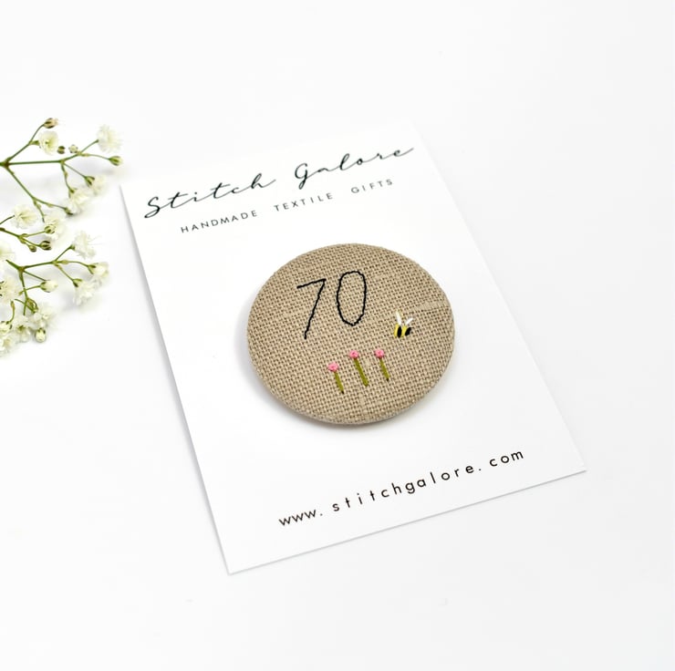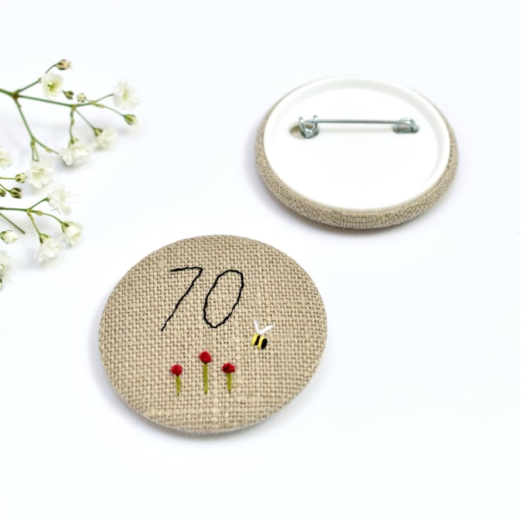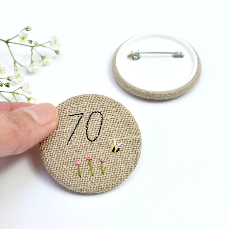 This simple but elegant embroidered 70th birthday pin badge is made from natural linen fabric. The birthday age is embroidered using freehand machine embroidery and the tiny flowers and small bee are delicately sewn by hand.
