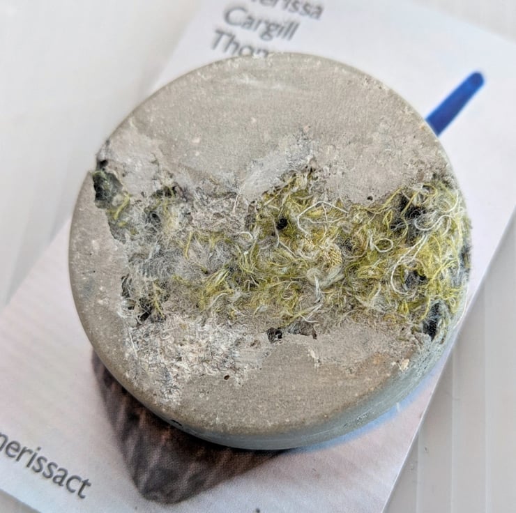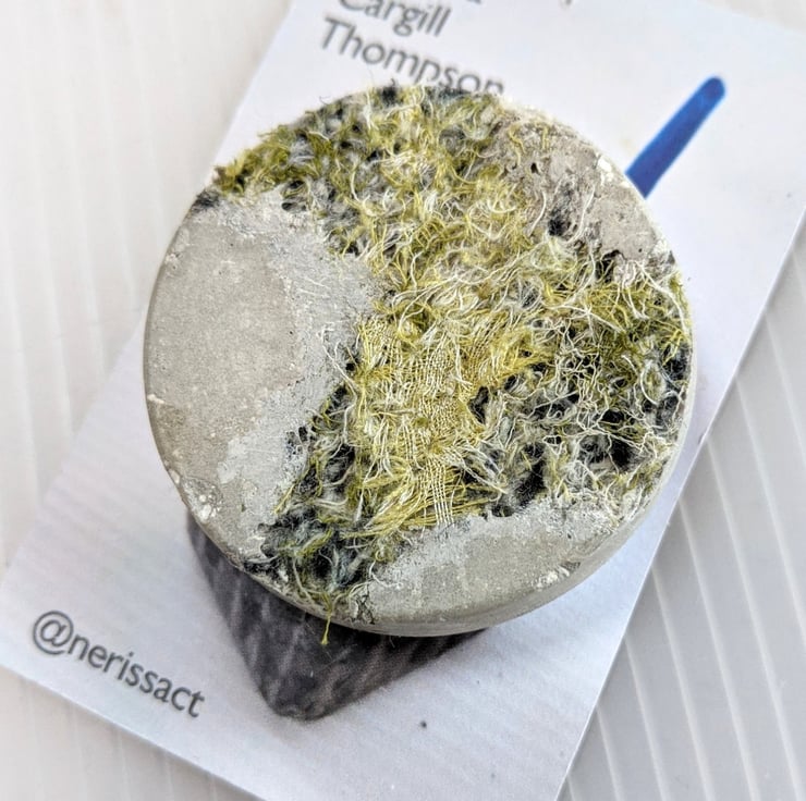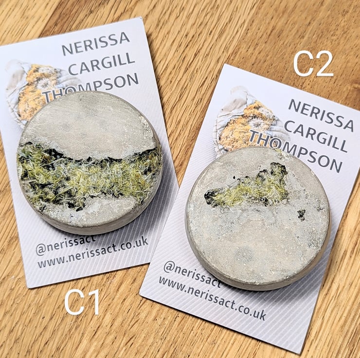To limit my waste, I turn my colourful textile offcuts into jewellery. I combine the embellished textiles with cement in plastic food packaging giving the resulting brooches a bold contrast of textures. These brooches are 50mm across and taper slightly to the front. Each unique brooch has a standard safety clasp back attached using epoxy resin.