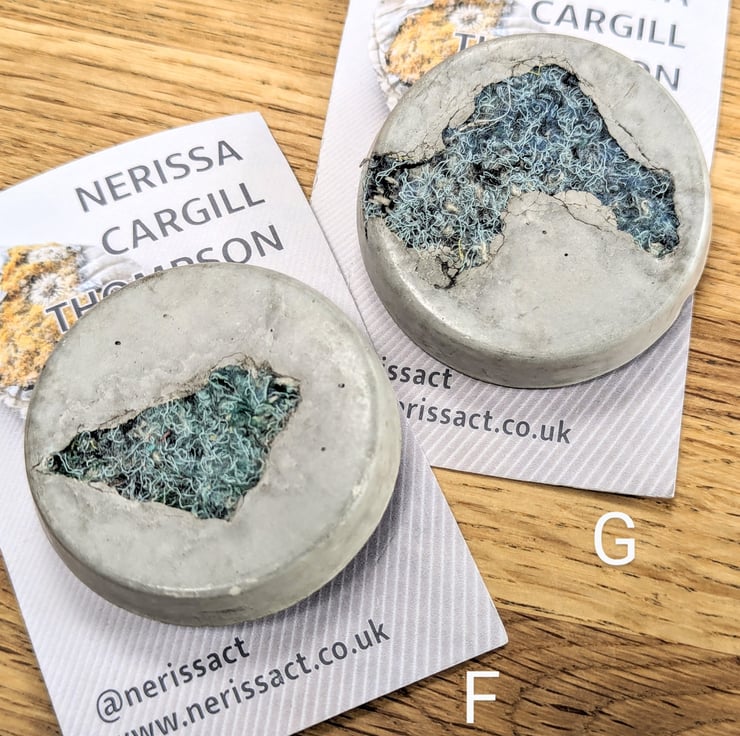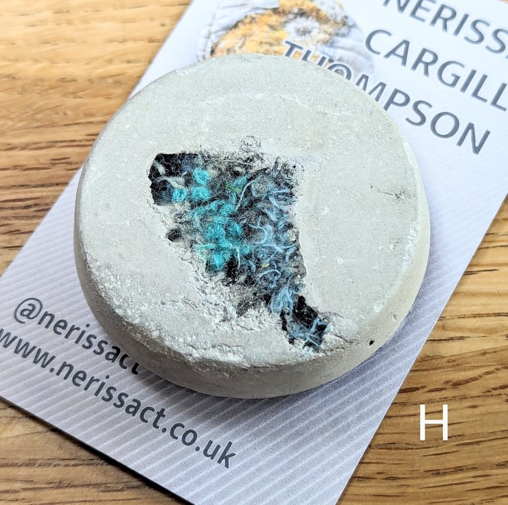 To limit my waste, I turn my colourful textile offcuts into jewellery. I combine the embellished textiles with cement in plastic food packaging giving the resulting brooches a bold contrast of textures. These brooches are 50mm across and taper slightly to the front. Each unique brooch has a standard safety clasp back attached using epoxy resin.