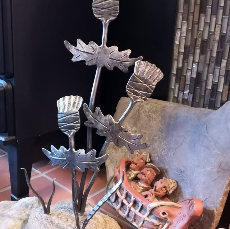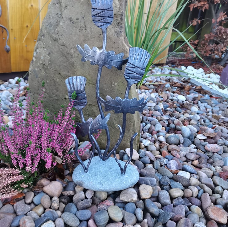 This is a hand forged thistle sculpture in a stone base, it is coated with clear coat lacquer. This product is handmade by me from my traditional blacksmith forge in Scotland. The stone base can vary as i collect the stones that i use as the base from different beaches around Scotland. This sculpture is around 40cm tall at the biggest thistle.