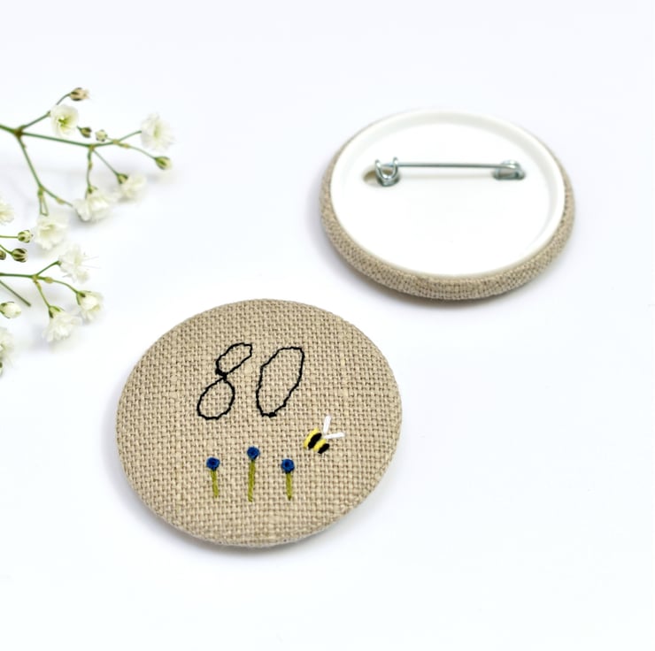 This simple but elegant embroidered 80th birthday pin badge is made from natural linen fabric. The birthday age is embroidered using freehand machine embroidery and the tiny flowers and small bee are delicately sewn by hand.