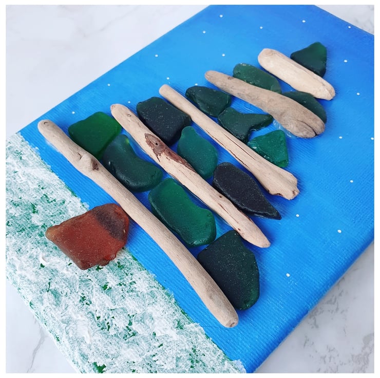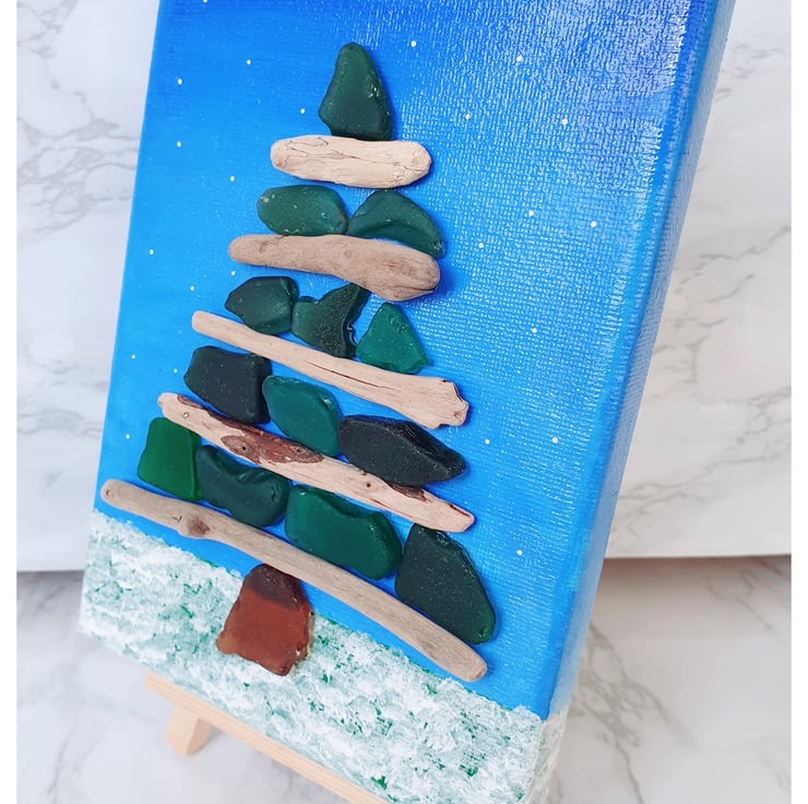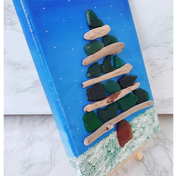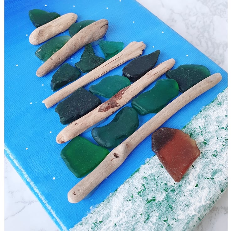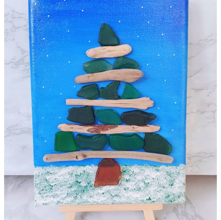 This art piece was created with seaglass and driftwood on a painted canvas depicting a snowy scene. The canvas has been painted with acrylic paint and lightly sealed with varnish. Canvas measures approximately 17.5 cm x 12.5cm. This piece can be hung or displayed on a shelf. Stand included.