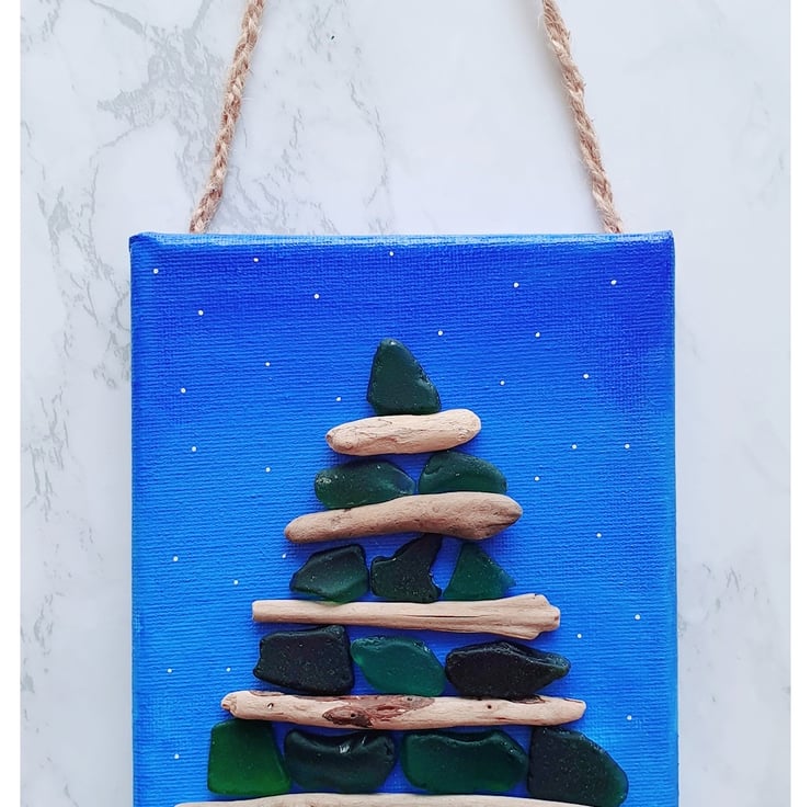 A lovely piece of seaglass and driftwood art of a pine tree to always remind you of the beauty of winter. Display this pretty pine tree on a wall or anywhere in your home as part of your decor.