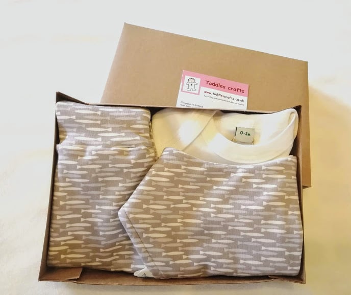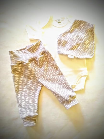 The perfect gift set contains handmade soft and stretchy jersey yoga pants, an ethically produced cotton T-shirt or bodysuit and a fleece backed adjustable bandana bib. All presented in a gift box which is super easy to gift or post.