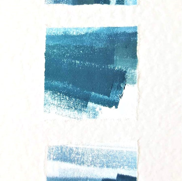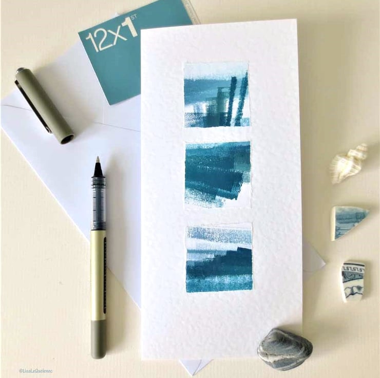 Abstract mixed media art card in tones of navy, teal and whitel inspired by the beach defences, sea, salt and spray.