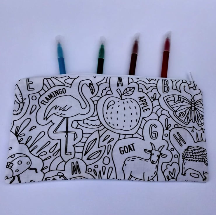 Colour in the pencil case with fabric pens for a permanent design or use washable pens so that you can colour it again and again...