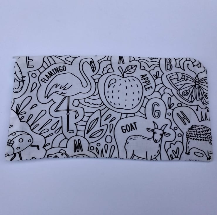 This is a pencil case that you can colour in yourself to make it an individual design. The pencil case measures approximately 25cm/ 10inches in length and is approximately 13cm/ 5.25inches deep. The pencil case has been lined with a black cotton fabric.