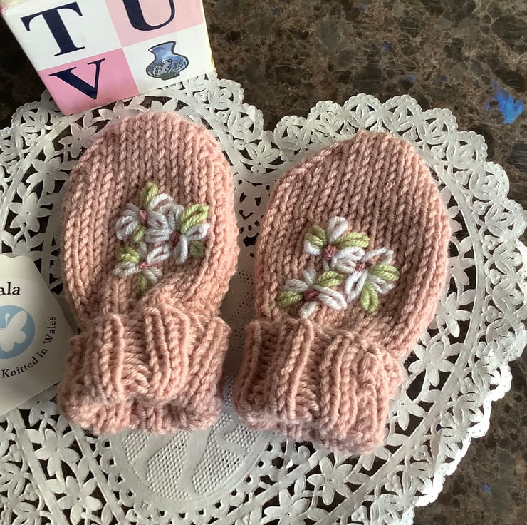 They are for age 0-6 months. They are baby pink in colour and have embroidered white daisies on the front. They have a double cuff to help keep the mitten in place.