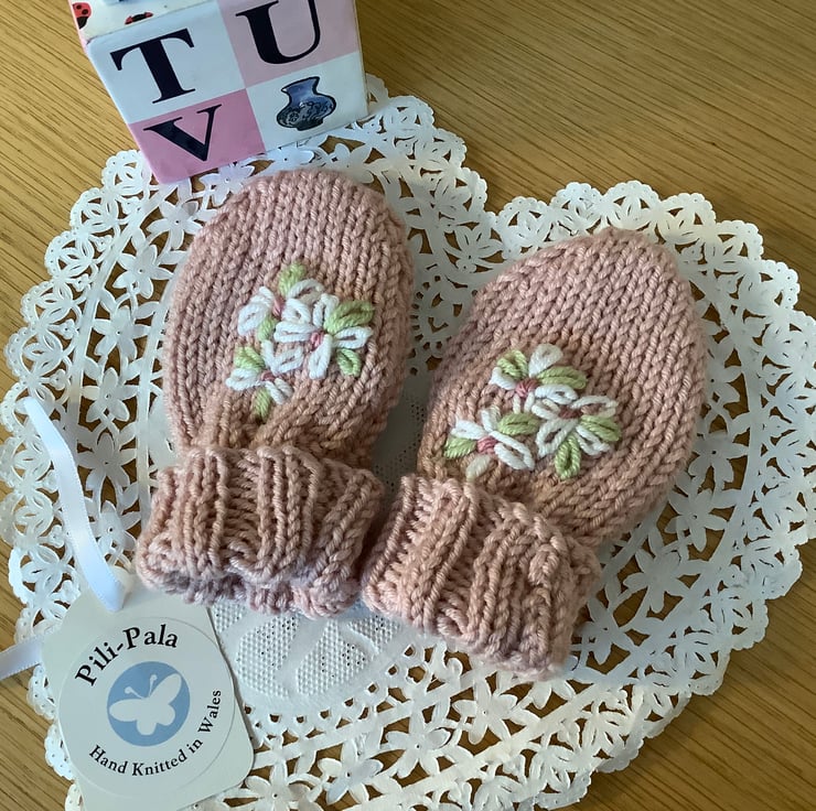 These pretty little mittens were hand knitted by me. They are knitted in a cashmere blend wool that is soft and warm for babies hands but can also be machine washed at 30 degrees.