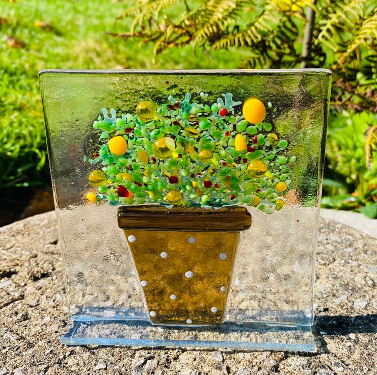 Fused glass flower pot design with polka dots on brown pot . Freestanding ornament that is 4inch square and stands on a clear glass base . Lovely for a shelf or window sill