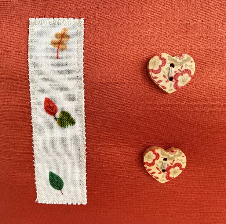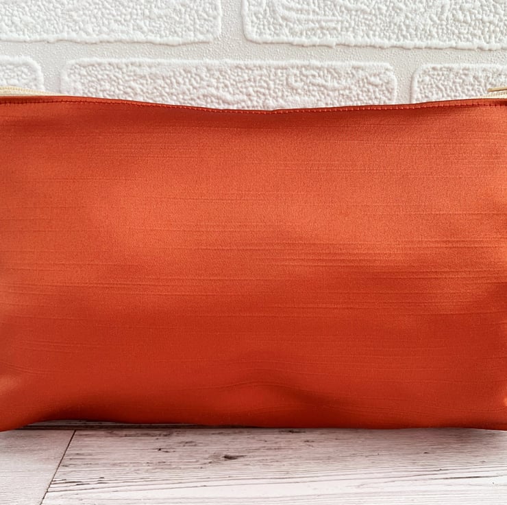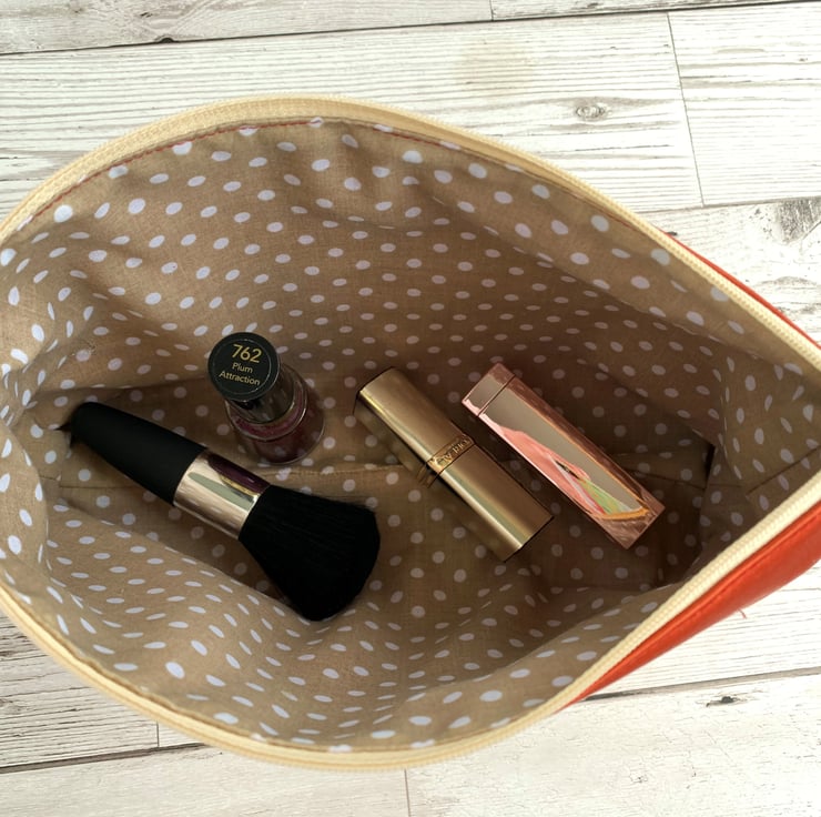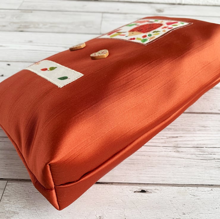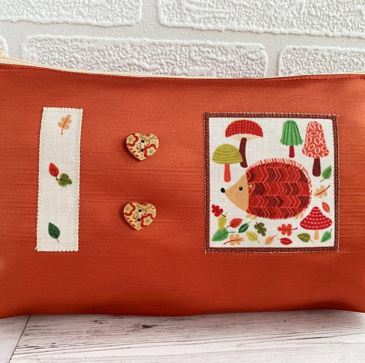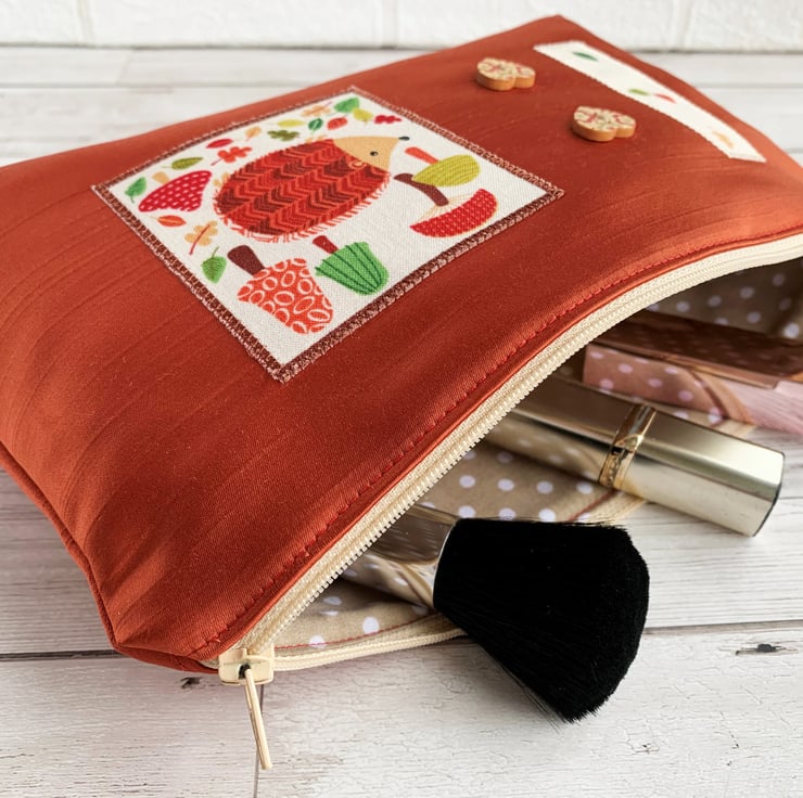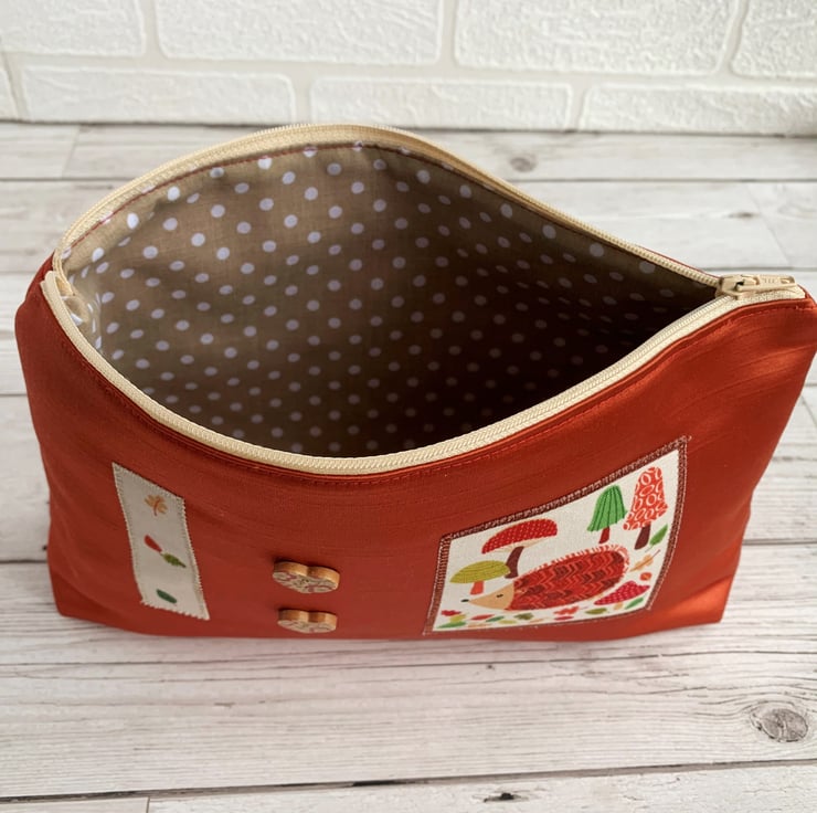 A large woodland make up bag with a hedgehog and mushrooms decorative panel. The bag is made from beautiful burnt orange satin fabric. I've cut the decorative panel from some delightful woodland print fabric. The panel features a large hedgehog amongst a cluster of mushrooms and a scattering of autumn leaves. The colours include autumnal shades of russet, red, green, orange, beige and brown on a cream background. There is a second, narrow fabric panel in cream with tiny autumn leaves. Between the two panels, I've added two wooden heart shaped buttons with a red and beige floral pattern. The cosmetic bag fastens with a cream zip and is lined with beige fabric with white polka dots. The base of the bag is boxed to give lots of room inside.