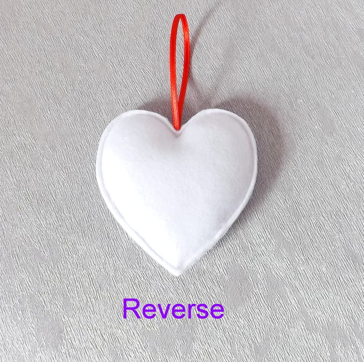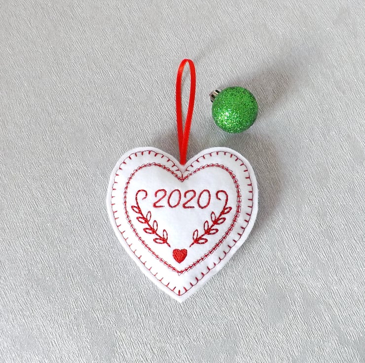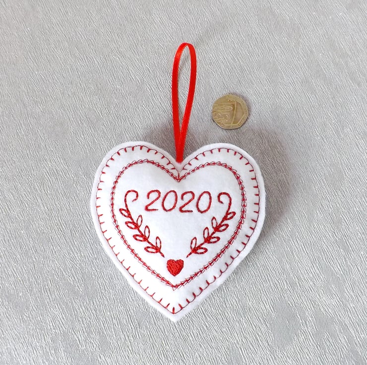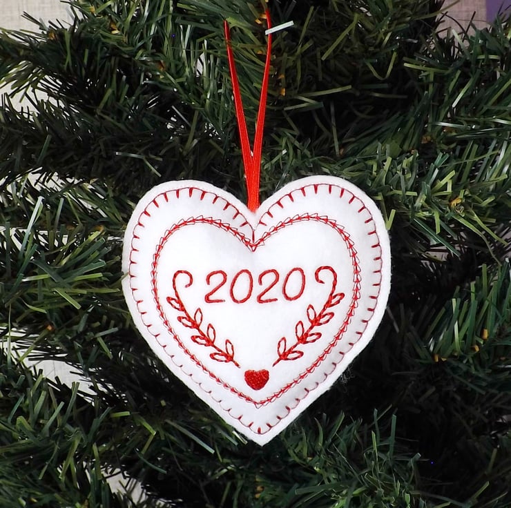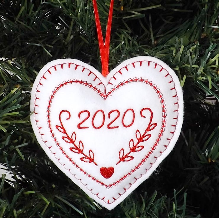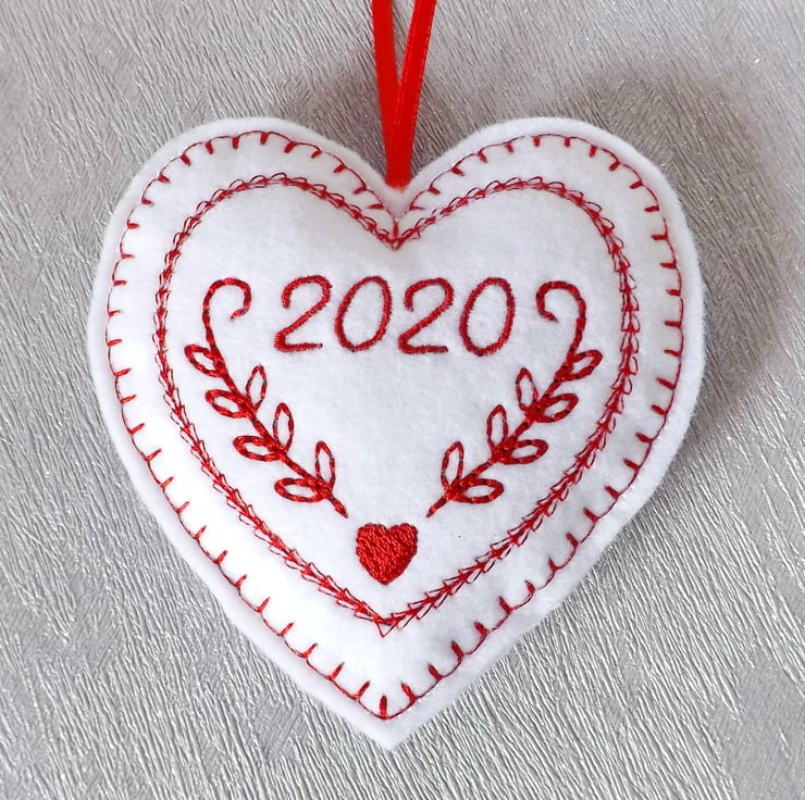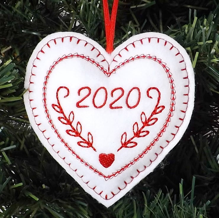 Embroidered on the front with a floral and heart design with 2020 in the centre, using rayon embroidery threads in red, and stuffed with polyester stuffing.