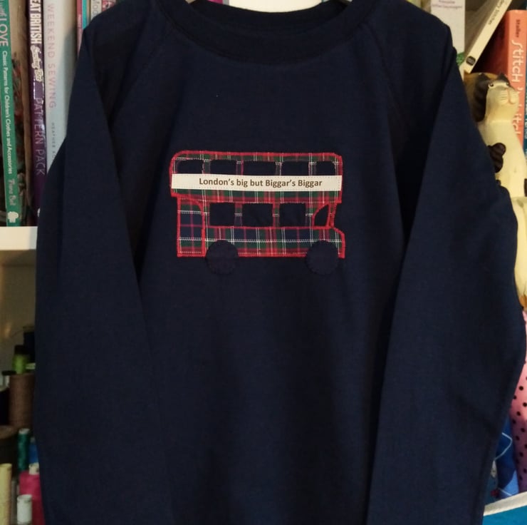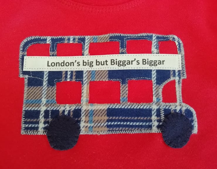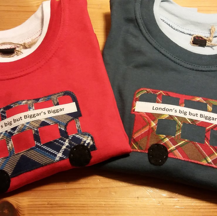 "London's Big but Biggar's Biggar" Skater style long sleeve T-shirt with applique bus design. Available in a red T-shirt with blue plaid bus or blue T-shirt with red plaid bus.