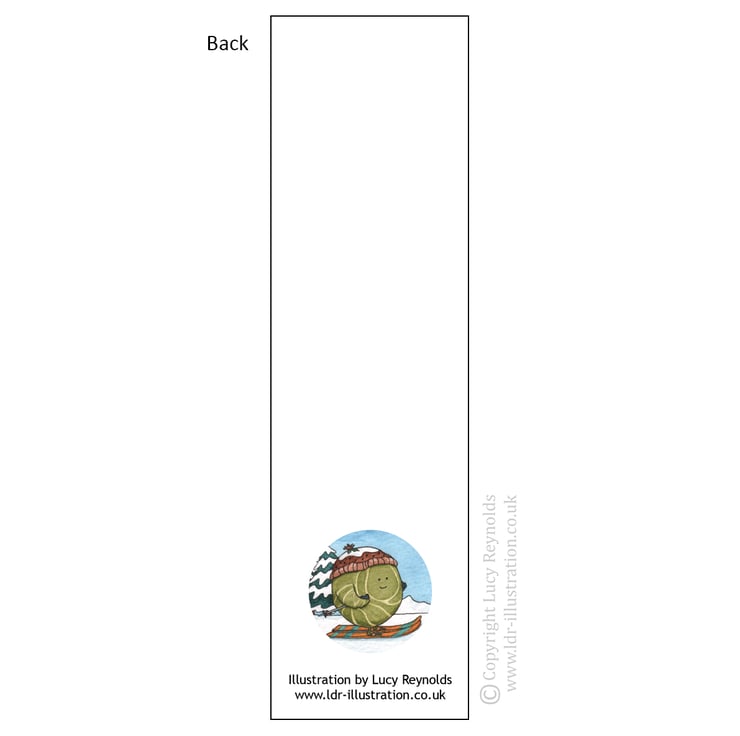 Illustrated bookmark, featuring my skiing sprouts. I painted the original illustration with watercolours. Each bookmark measures 52mm by 185mm and is printed on heavyweight silk card.