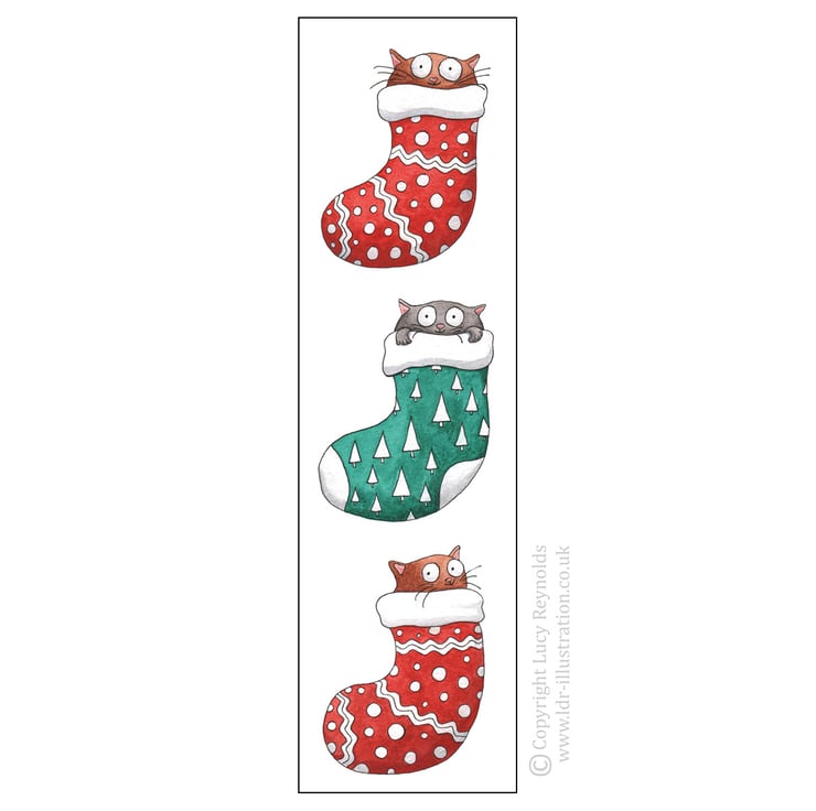 Illustrated bookmark, featuring my cats in stockings. I painted the original illustration with watercolours. Each bookmark measures 52mm by 185mm and is printed on heavyweight silk card.