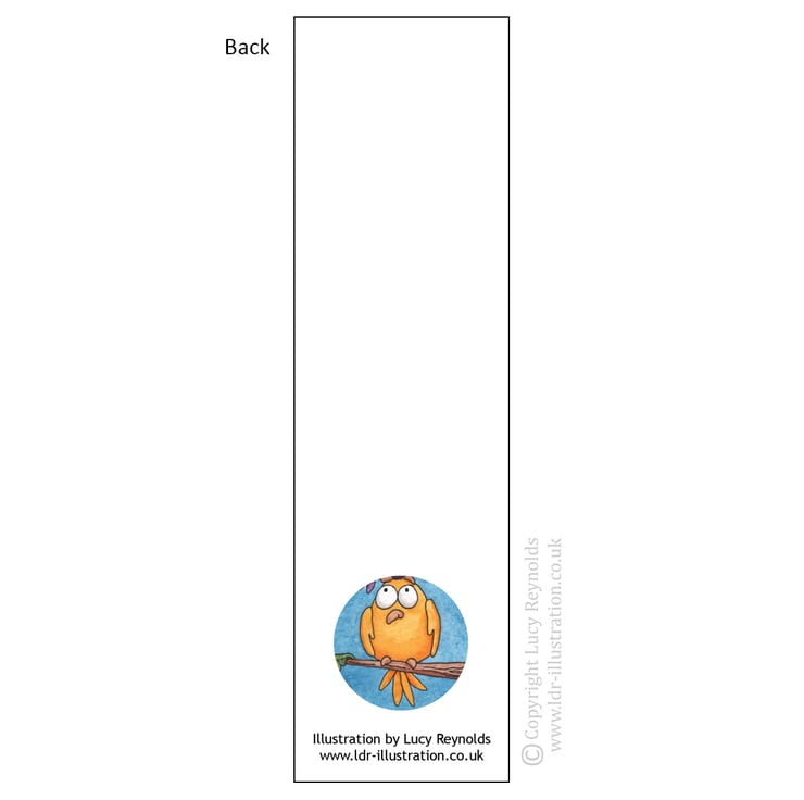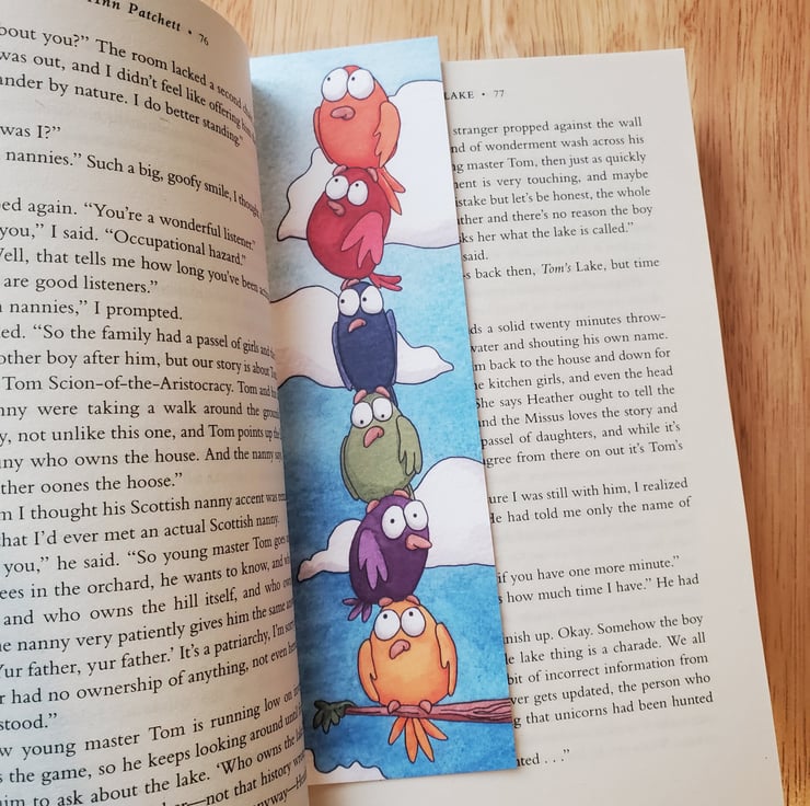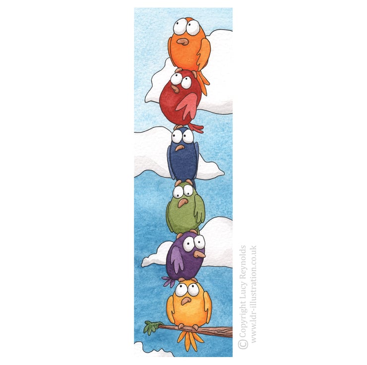 Illustrated bookmark, featuring a tower of colourful birds. I painted the original illustration with watercolours. Each bookmark measures 52mm by 185mm and is printed on heavyweight silk card.