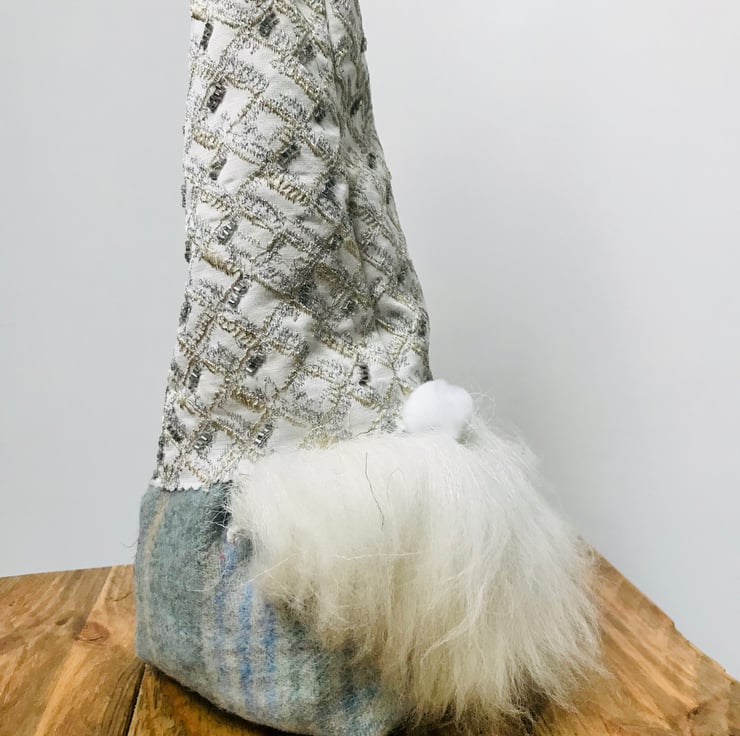 REFORM: I've transformed old curtains (from my mum) for his body, sheepskin off-cuts (from Clapham, North Yorkshire) for his beard and wool blanket off-cuts (from Keighley, West Yorkshire) for his hat, into a beautiful decorative item.