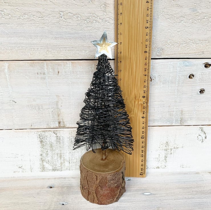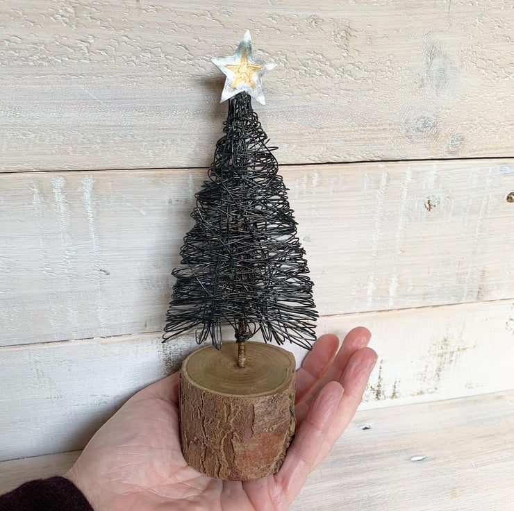 Crafted from wire with a hand painted metal star, this little Christmas tree sits on a wood slice base.