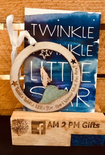 This Item is Wood and Hand Painted with the Engraved Wording Twinkle Twinkle Little Star . This Item comes with a Hanging Ribbion and the Words to Twinkle Twinkle Little Star