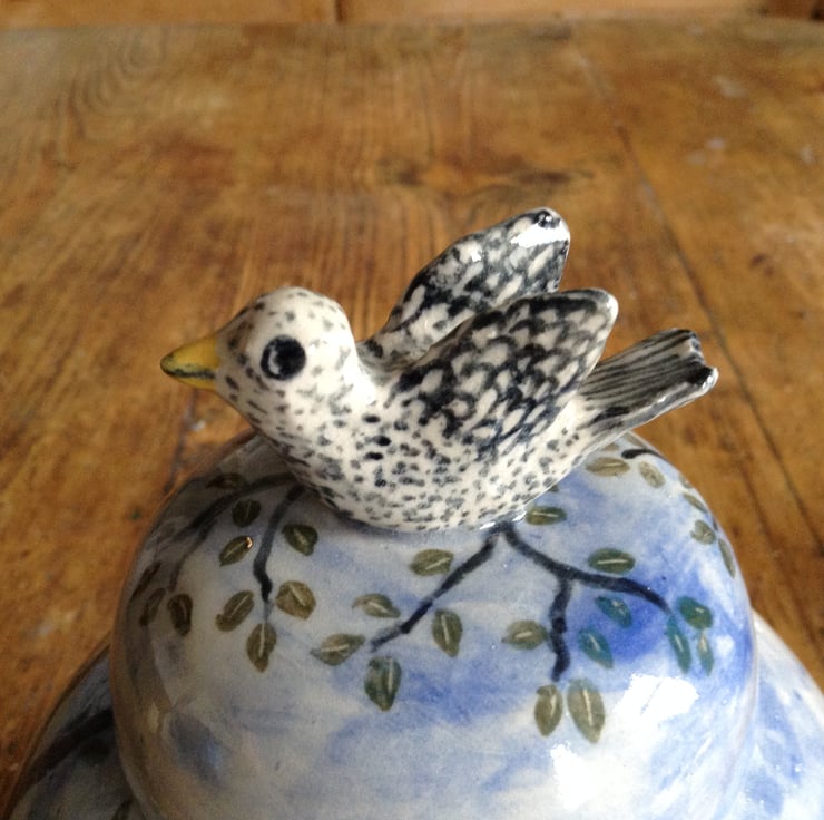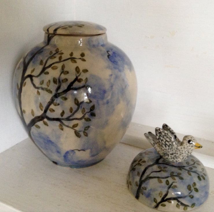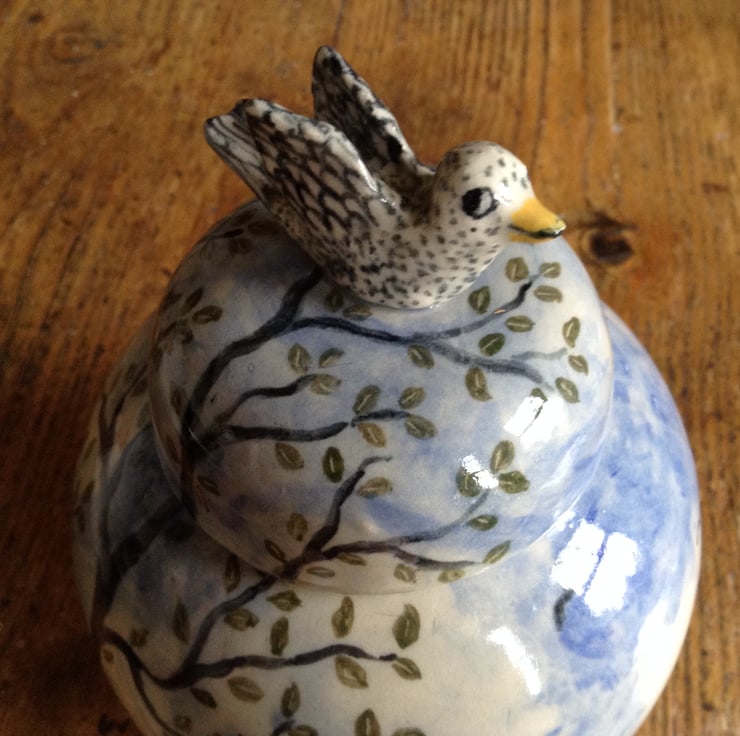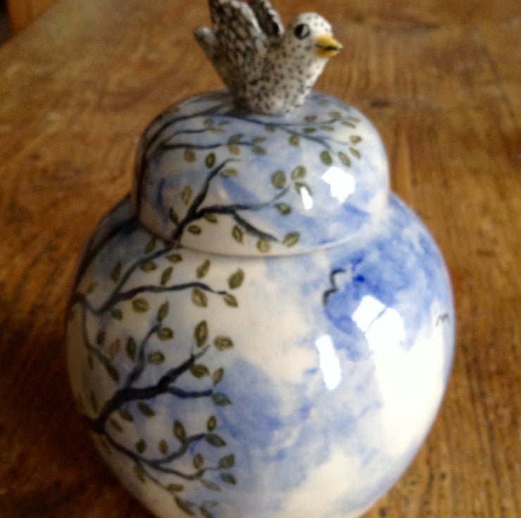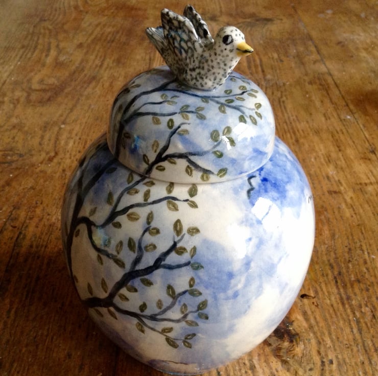 Beautiful handmade and hand painted storage jar with a hand sculpted winged bird on the lid. The jar is a traditional ginger jar shape and has an inside domed lid. It is made of tough high fired stoneware clay and is decorated with trees, birds and clouds with a blue sky. It has a glossy transparent glaze. It measures 18.5 cms high x 12 cms across. The jar is microwave and dishwasher safe, apart from the top lid which should be hand washed.