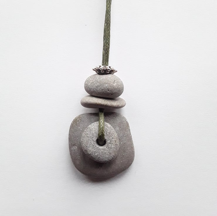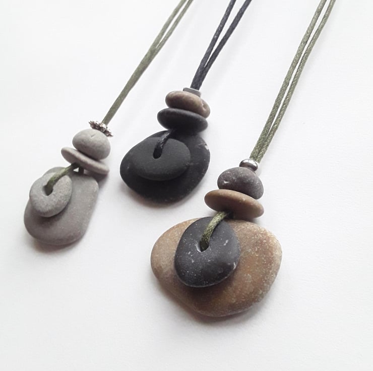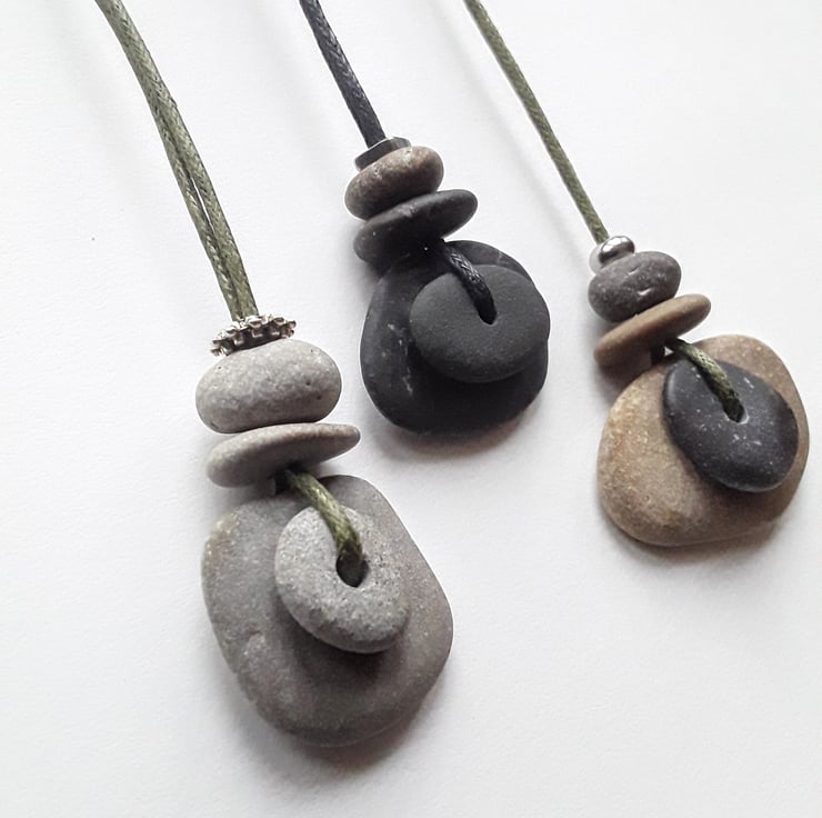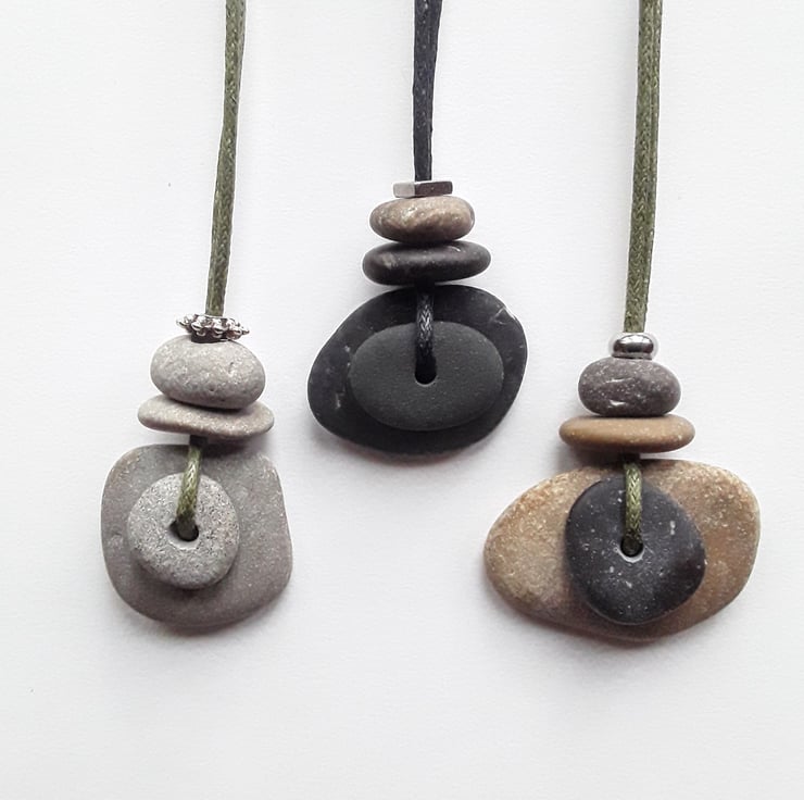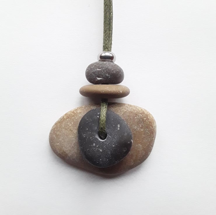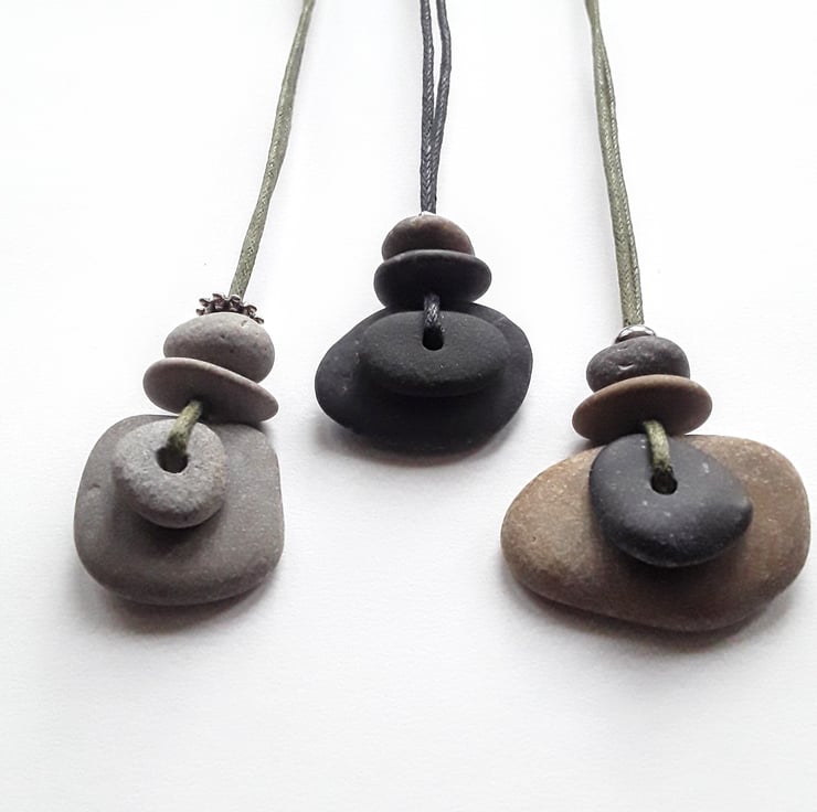 3. Fawn/pale tan 3.5cm x 2.5cm oblong-ish pebble, with darker grey and fawn pebbles, stainless steel round bead on top, measuring 4cm x 3.5cm in total. A 17" pale khaki cotton cord.