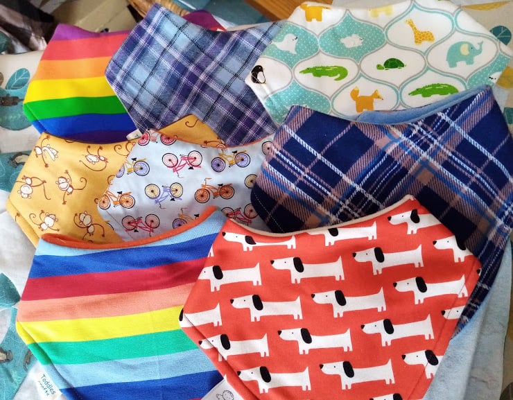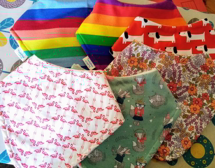 Dribble bib with cotton or cotton jersey front to absorb the dribbles and a soft fleece backing to prevent clothes getting wet. Adjustable snaps at the neck, so one size fits all.