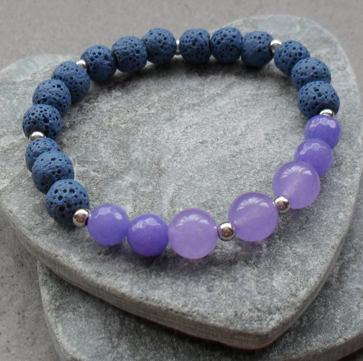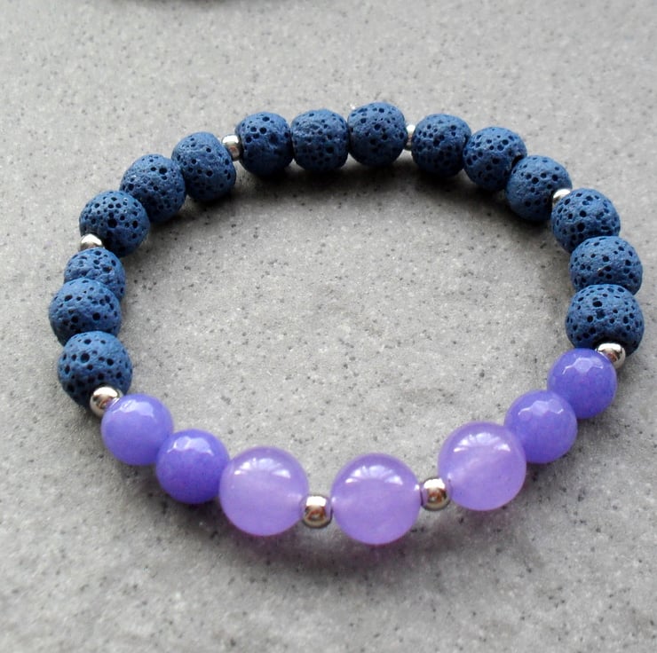 Bracelet with dyed lilac quartz's with blue lava rock and small silver plated spacer beads are beaded onto elastic.