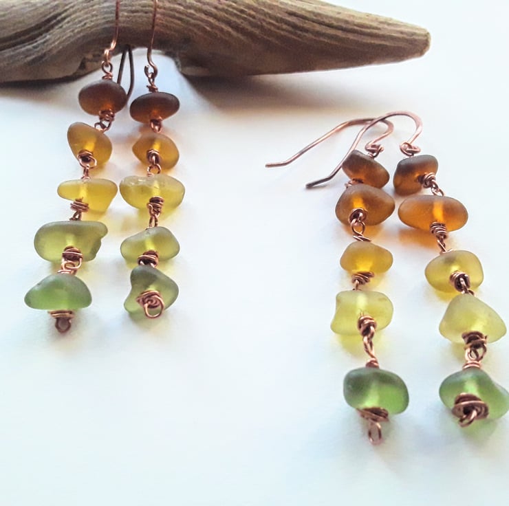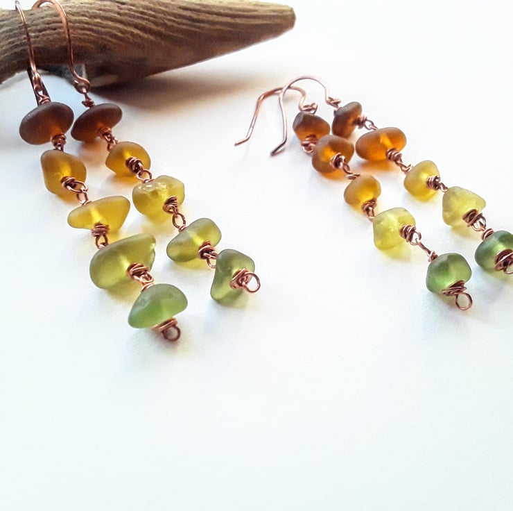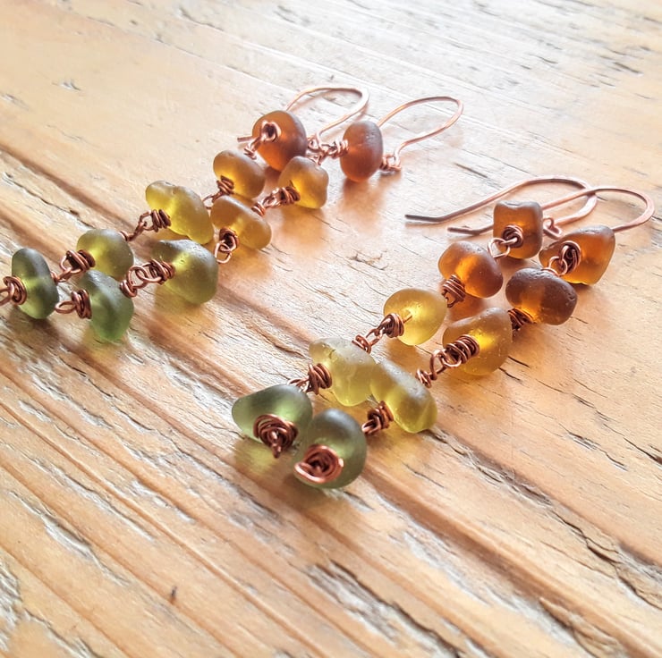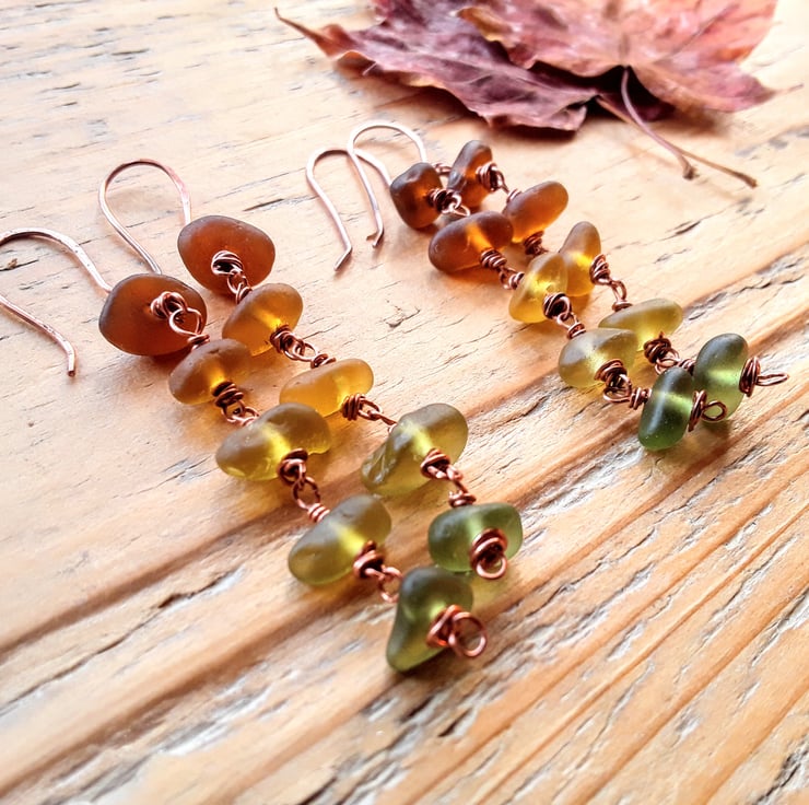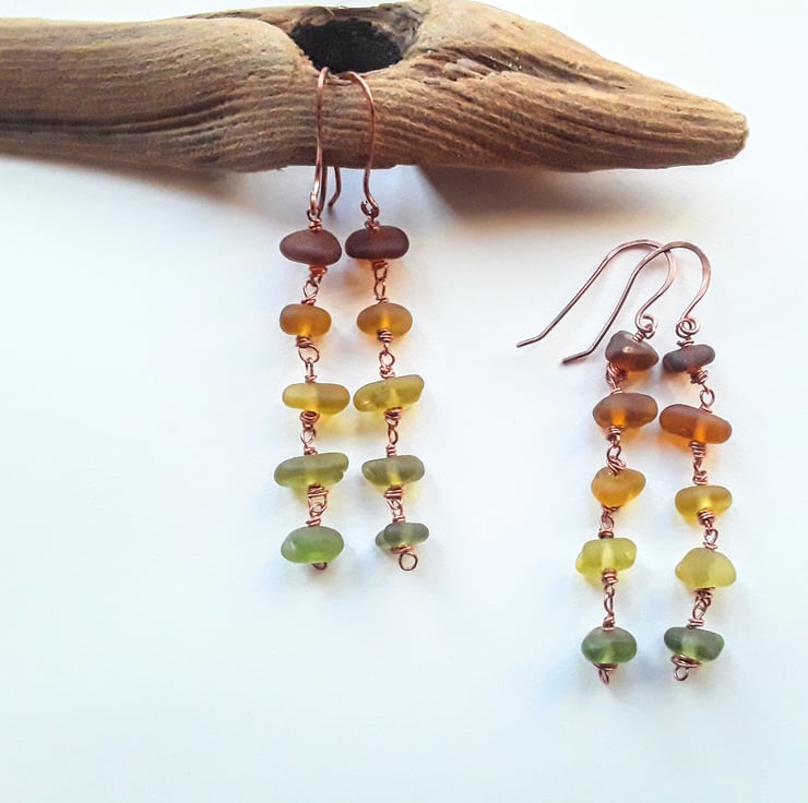 Each 6cm long earring has been made from five little seaglass nuggets of earthy, fun autumn colours.