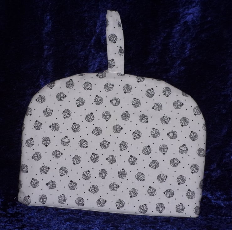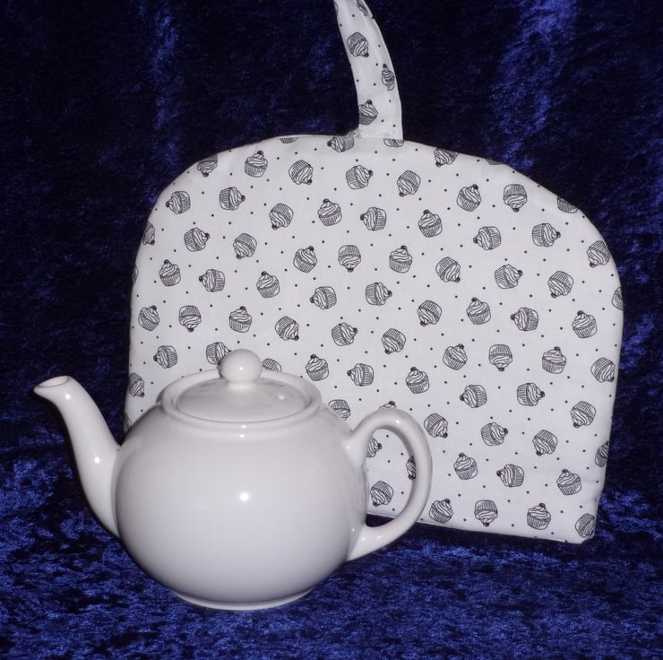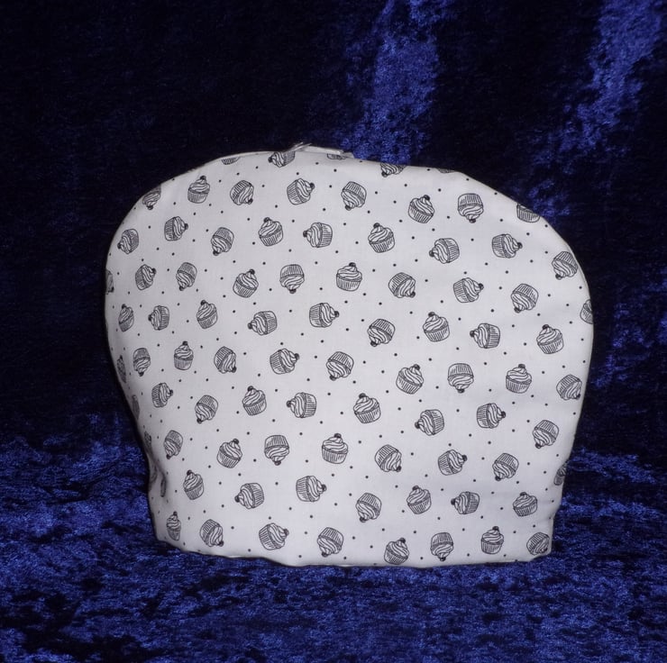 The design of this tea cosy that will fit a 2 cup (0.5L) teapot is black outline cupcakes on a white background. It is fully washable and the wadding is stitched to the lining fabric to prevent is from moving and bunching up when it is washed.
