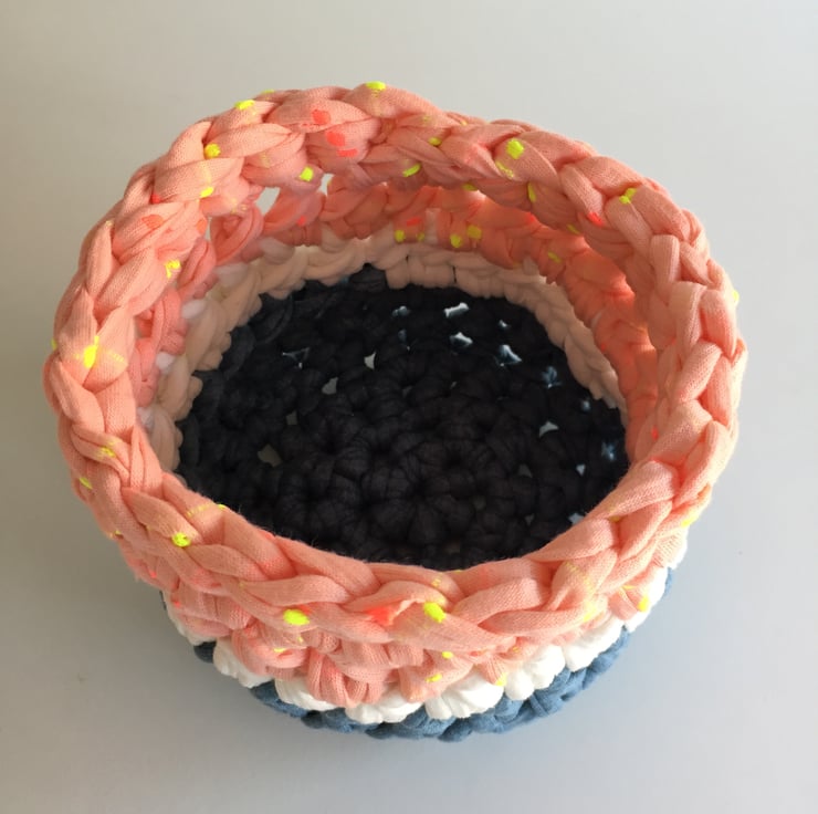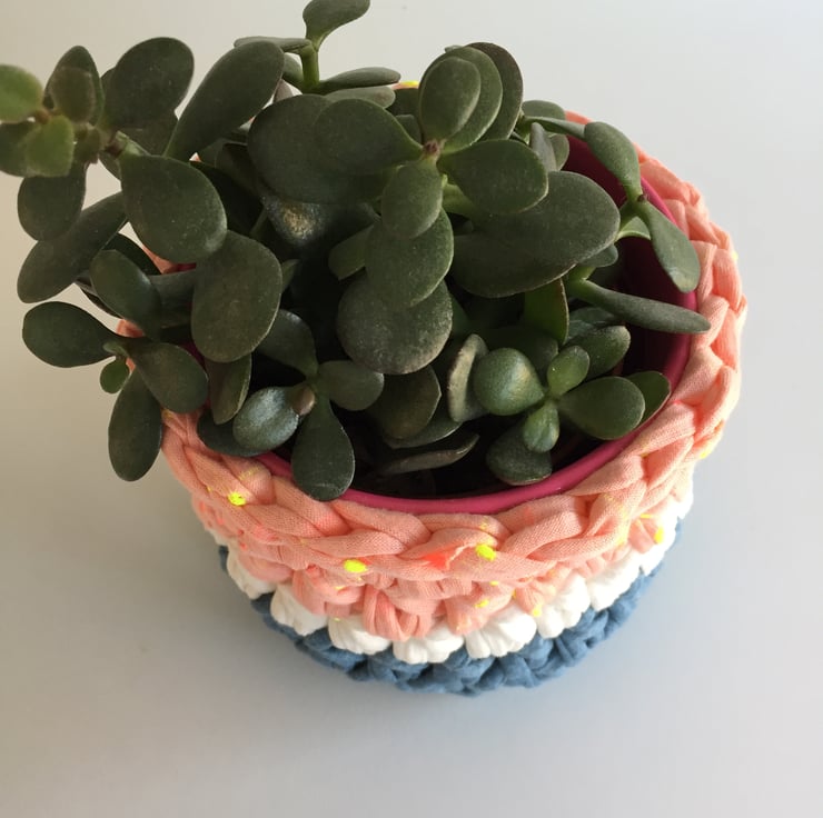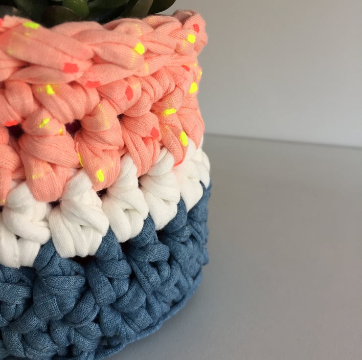 Made with sturdy upcycled textile yarn in pretty shades of denim blue, white and peachy pink with neon yellow and pink spots, the basket is approx 11cm diameter and 10cm tall. It is designed to accommodate a standard 10cm plant pot but will stretch slightly to fit different shapes.