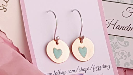 Really sweet, these lightweight swinging copper earrings, have a nice little teal coloured heart shaped accent.