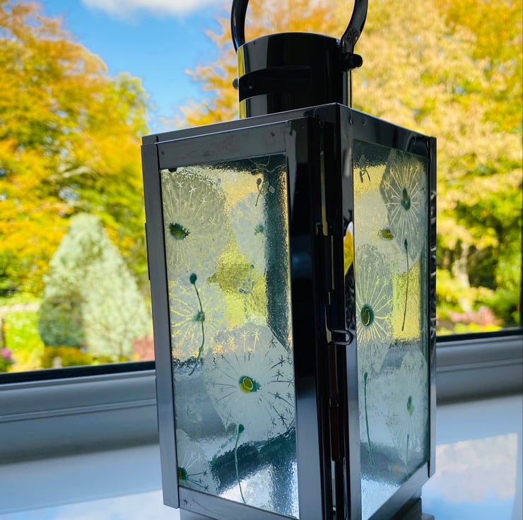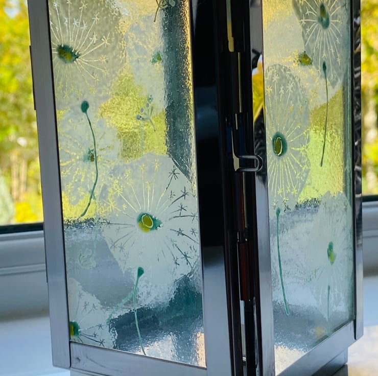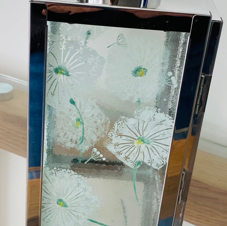A delicate design of enamelled dandelions in fused glass set within a chrome lantern . Approximately 10 inches high . Pretty and unique . A pretty addition to your home . This item will be sent via parcel force as a medium parcel .