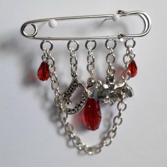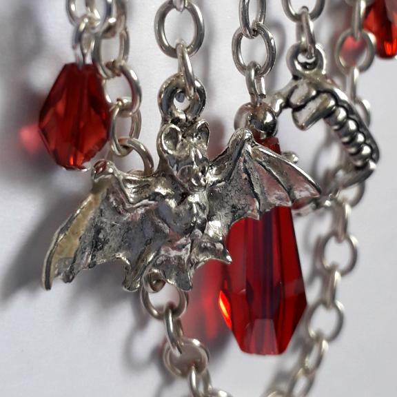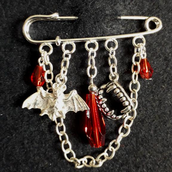 This 5 cm brooch has a flying bat charm, a fangs charm and red crystal drop beads, I have also added silver chain, the length is approximately 6 cm.