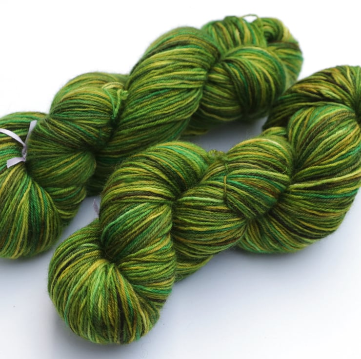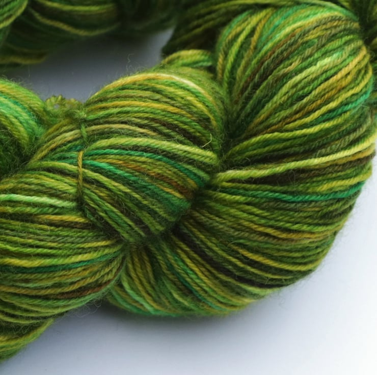 Leafy, mossy, vegetably shades of chartreuse, lime, olive and emerald green with a little brown. This Bluefaced Leicester superwash yarn is soft with a very slight lustre. Photos taken and edited in bright natural light. There is one skein left.