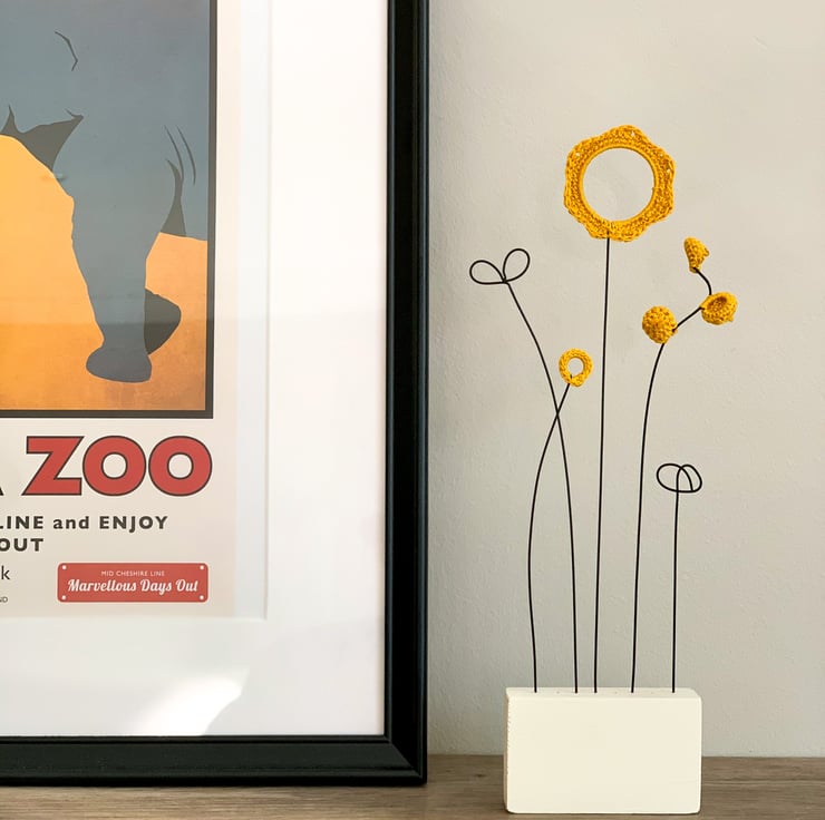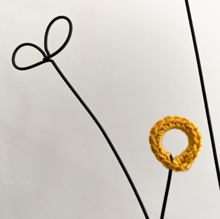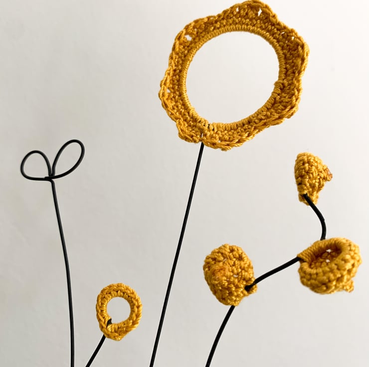 Wire flower stems with cotton crocheted flower heads add cheer to any space.