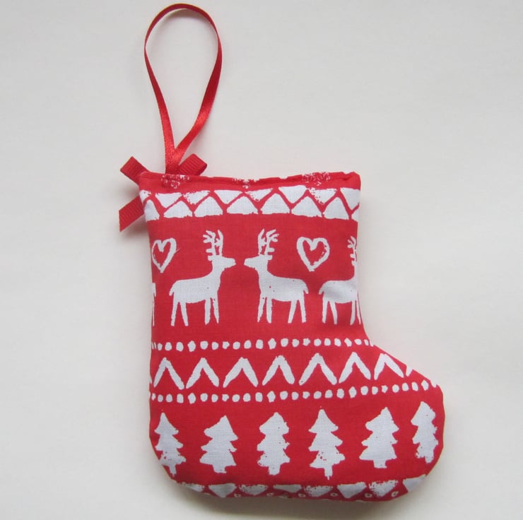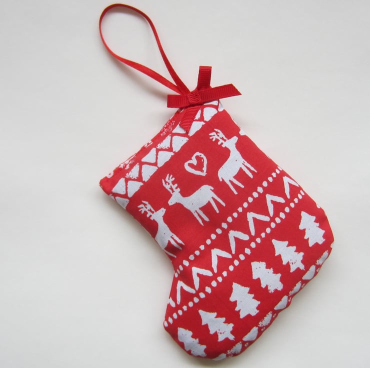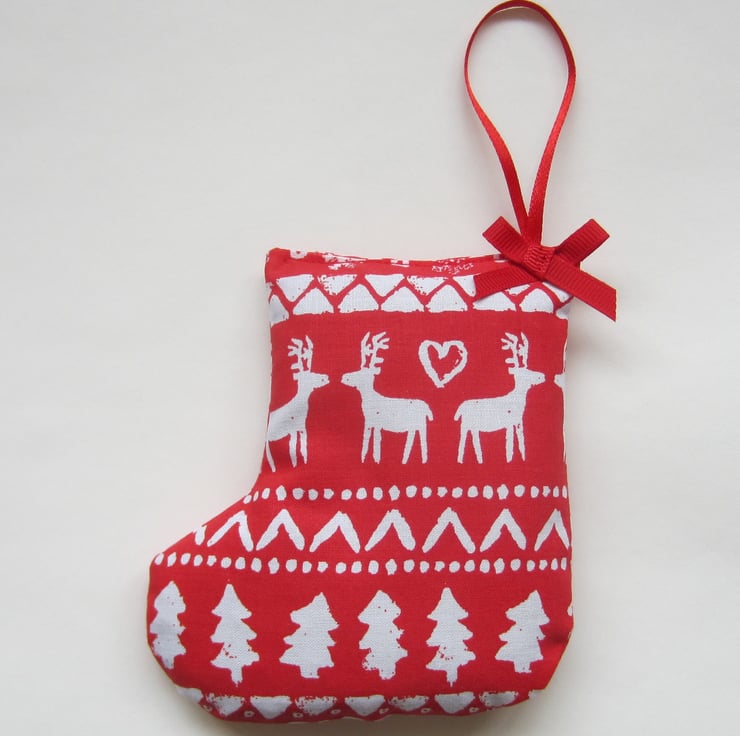 Hanging lavender bag in the shape of a boot in a Scandi style red and white stag Christmas fabric. It hangs with a red ribbon loop and has an added red ribbon bow.