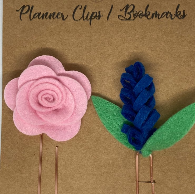 Perfect for any planner addict! A set of 2, 3 Dimensional light Pink Felt Rose and Blue Felt Hyacinth Flowers hand sewn and then stitched to 5 cm Rose Gold Clips.