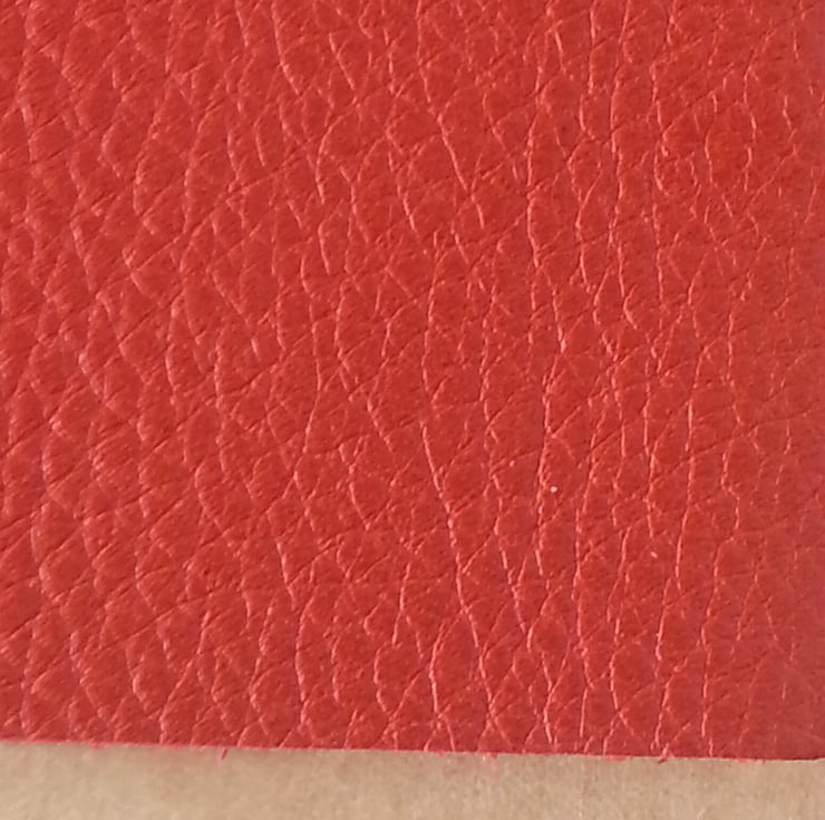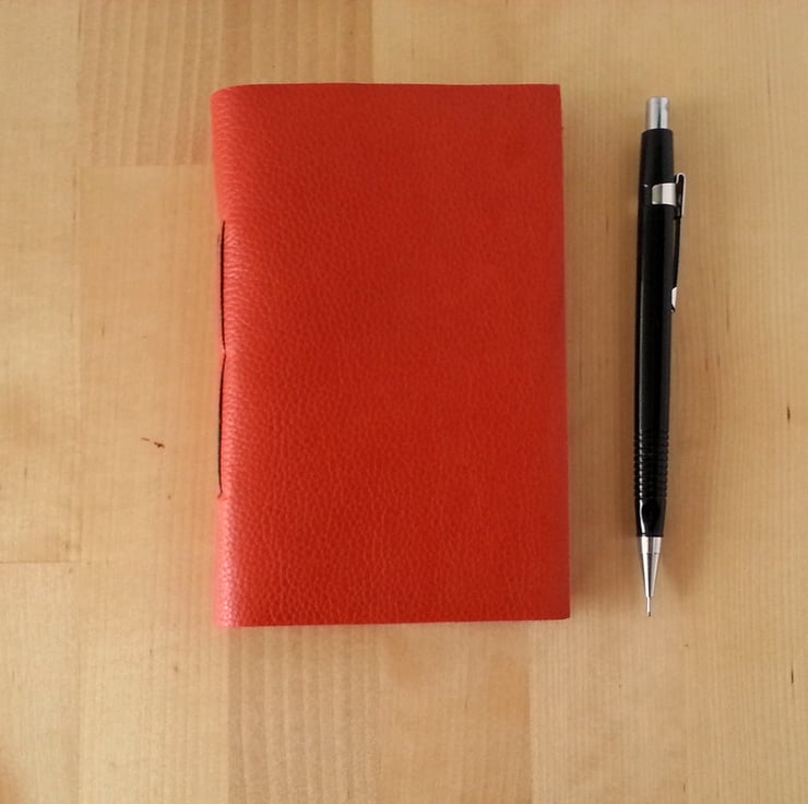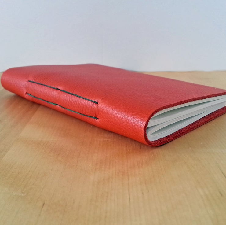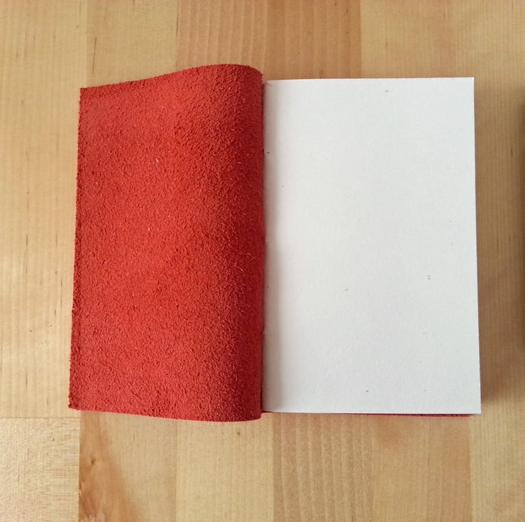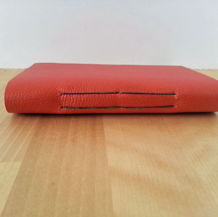 - The cover is soft, thick leather with a grained finish, in russet red. The leather is left unlined, as it is very attractive inside, as well as outside.