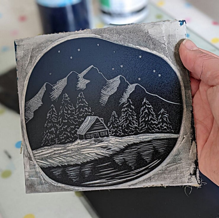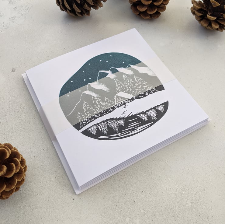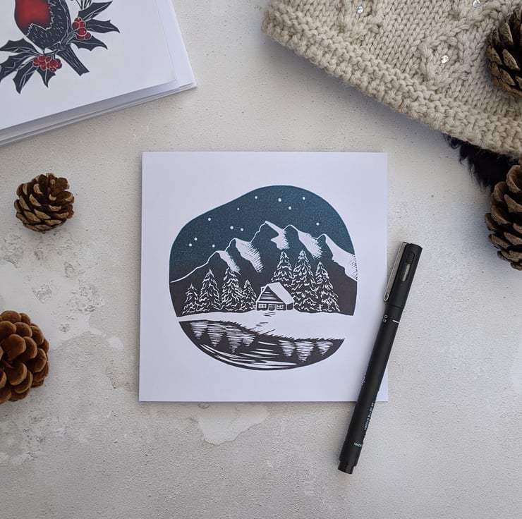 A traditional, cosy cabin inspired Christmas card, professionally printed in the UK from my original linocut on 300 gsm card.