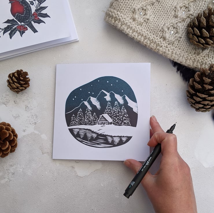 Every year I create a new Christmas card for my collection, and last years was a snow globe with a cabin in the mountains. This year I really wanted to expand on that design with another cabin in the woods which has ended up being much more detailed that the original one. Perfect for sending to your special friends this year to bring joy. If you would like something extra special, the limited edition print will also be available in my shop.