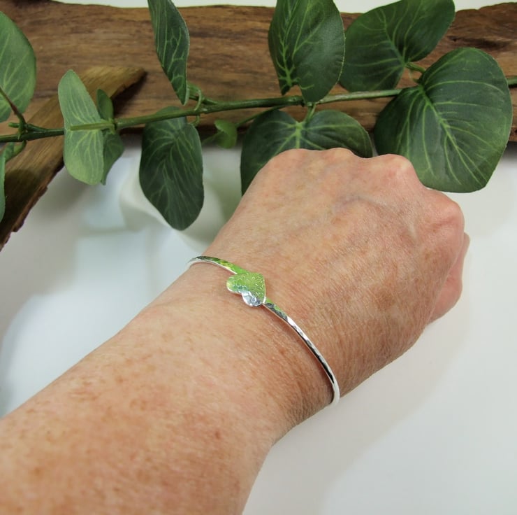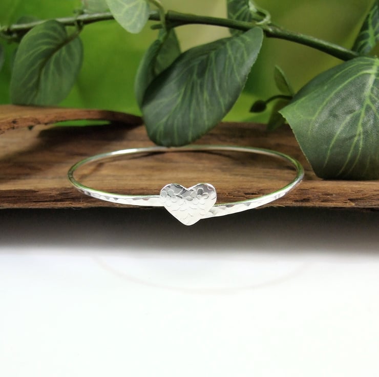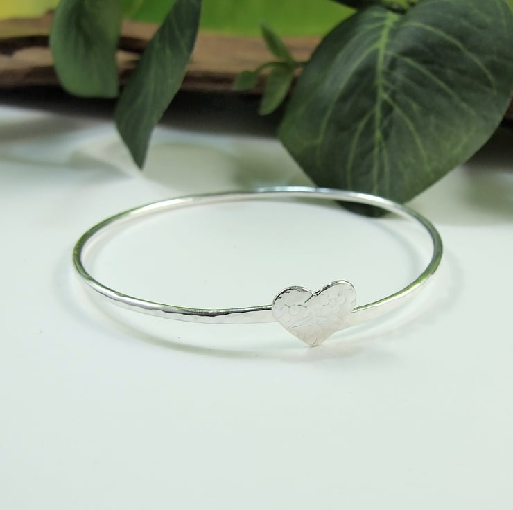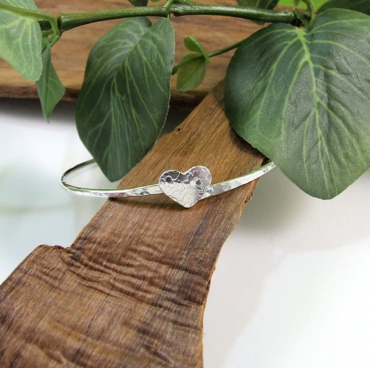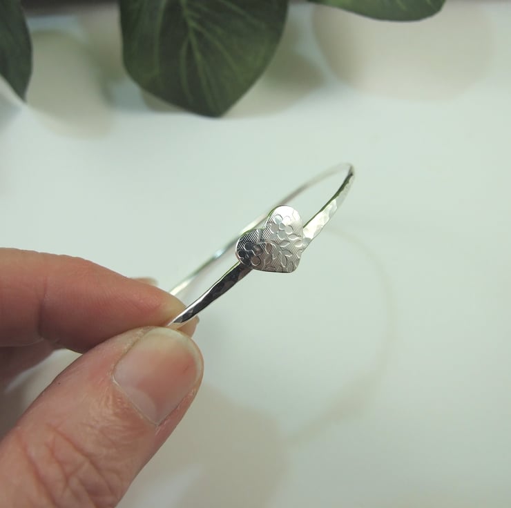 I have made the bangle from 2mm wide solid sterling silver wire which I have soldered shaped and hammeed fro texture. The little heart centre piece has been cut from silver sheet then textured with a floral pattern in my rolling mill and soldered to the front of the bangle.