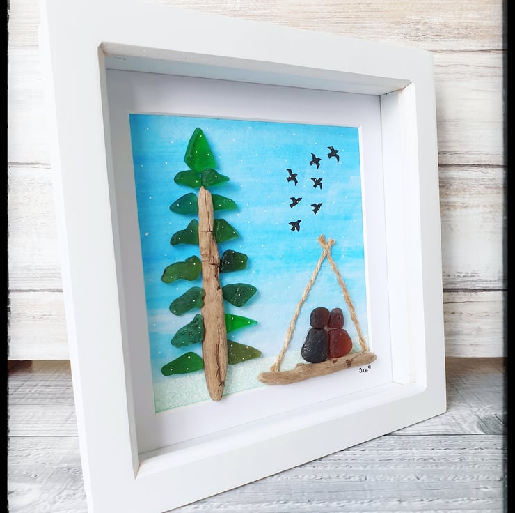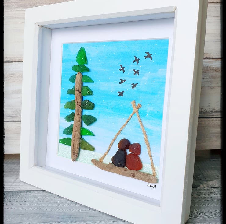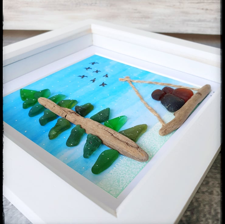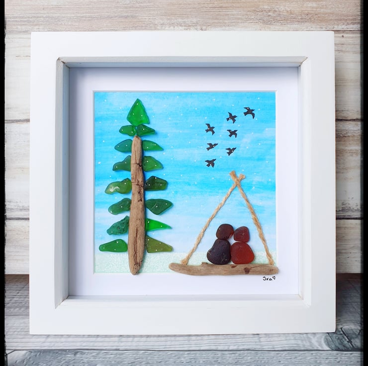 This piece was created with seaglass pieces and driftwood on watercolour paper. It depicts a couple sitting in a wigwam as they enjoy the falling snow. This will make a lovely gift to anyone to remind them to always enjoy the little moments of the winter season.