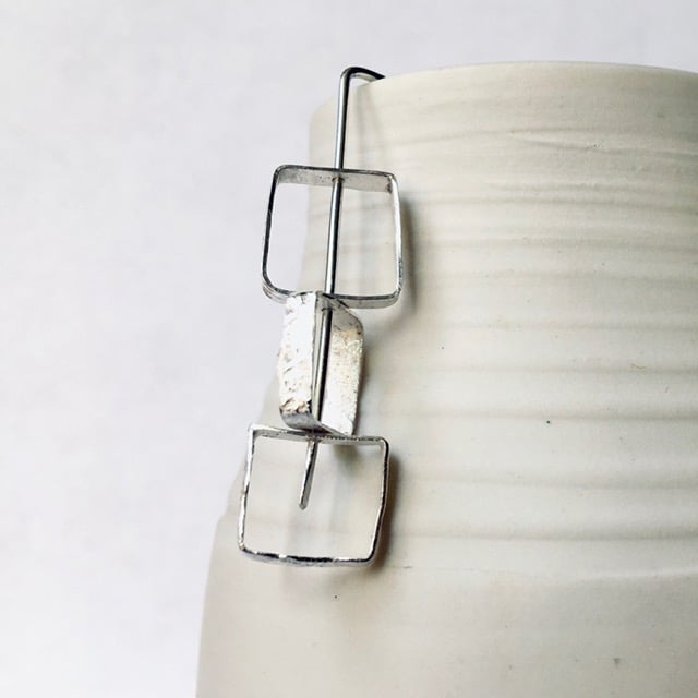 monolithic mini moving sculptures these earrings are contemporary and playful. Each organic 'square' swivels around the handmade earwire to provide movement and play. Tactile and textured these are super stylish - with the added bonus of playful movement - all kept minimalistic and uber chic.