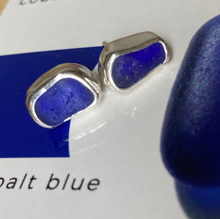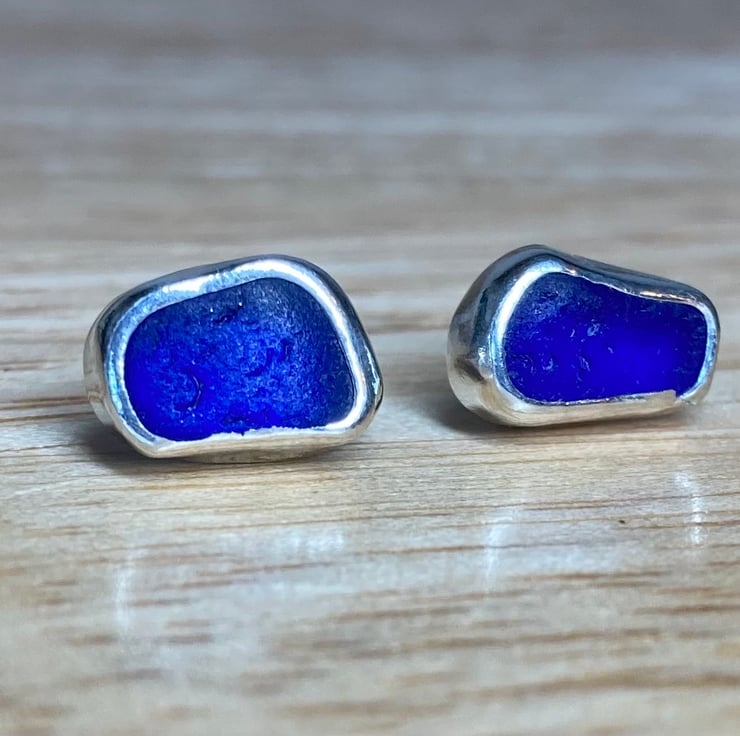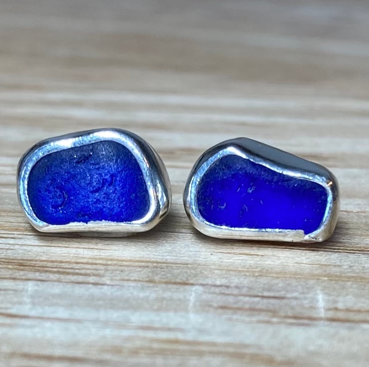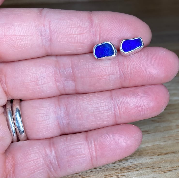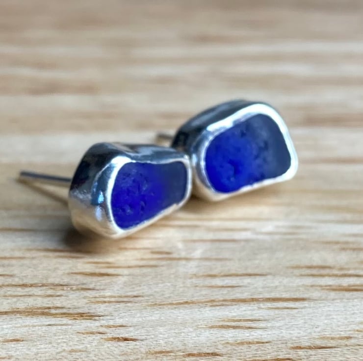 Beautiful dark cobalt blue sea glass and silver medium sized stud earrings, just gorgeous!