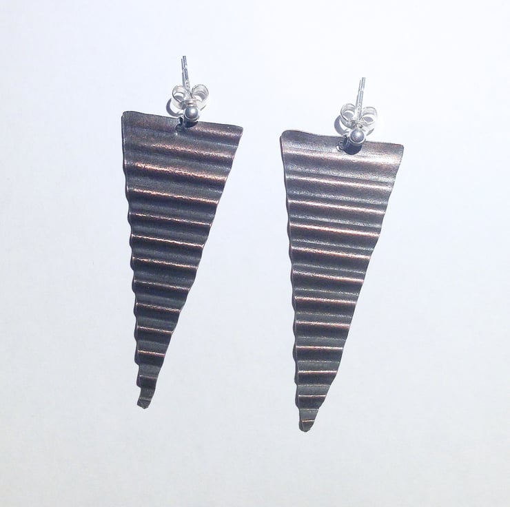 These lovely earrings have been hand sawed from copper sheet. They have been repeatedly hammered, corrugated to create a interesting texture and then polished, oxidised and slightly rubbed back to bring out the detail.