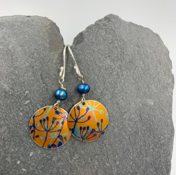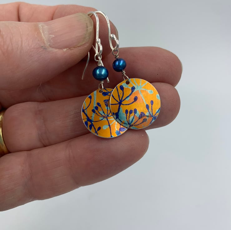 Beautiful, bright and bold! These anodised aluminium circles have been printed in two shades of blue with a cow parsley design. They were then dyed orange before being domed. They hang from a blue peacock pearl and sterling silver hook.