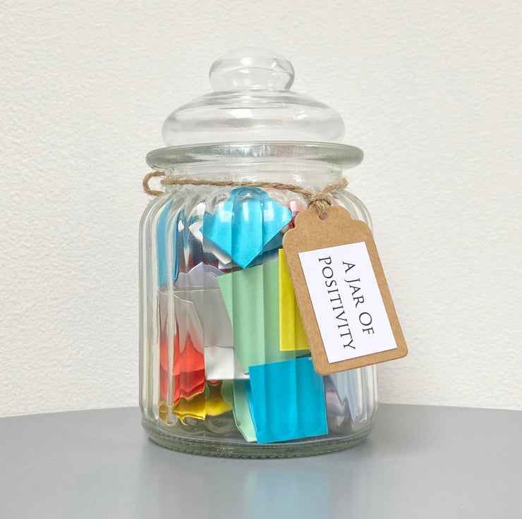Each jar contains a minimum of 50 quotes, which are individually handmade. The wording is printed in black on a mix of differenty coloured card pieces. The vintage style jar measures approx 5in x 3in / 13cm x 8cm and is made from clear glass.