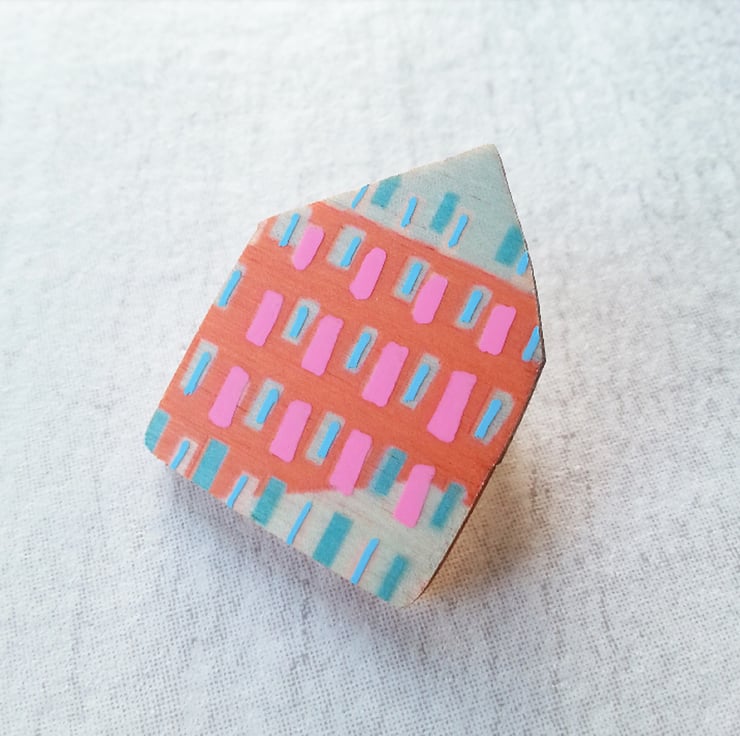 The brooch measures 3.5cm x 2.5cm with a metal lapel pin fastening on the back, perfect for wearing on jackets and jumpers. It would make a great gift for a lover of little houses and original design. The brooch comes attached to a pretty backing card ready to give as a gift or even keep as a present to yourself!