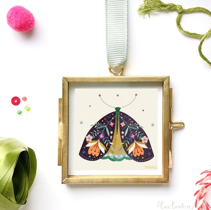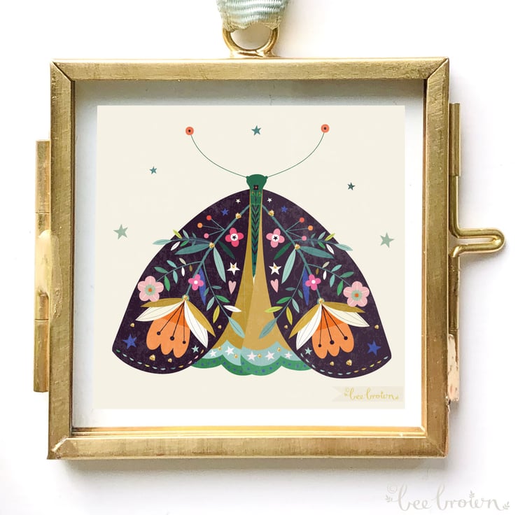 This is a miniature illustration of a decorative moth fitting into a tiny glass and brass frame with ribbon for hanging.