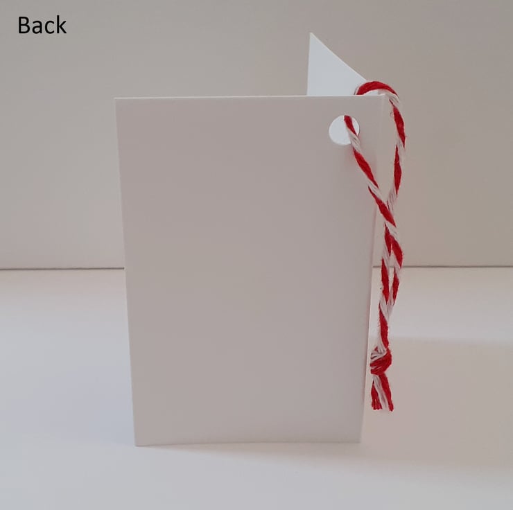 Folded rectangular gift tag (85mm by 55mm) with a stripy red and white thread.